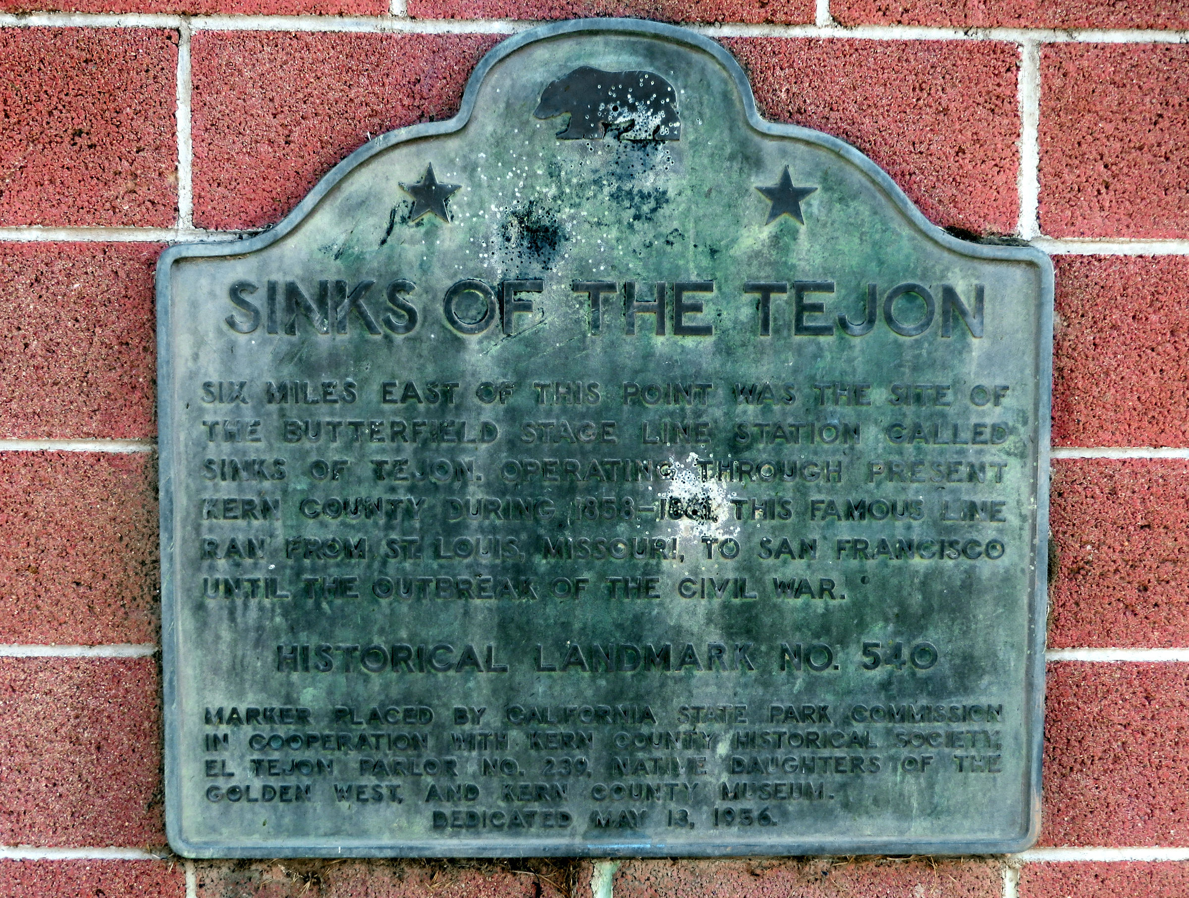 Marker placed by California State Park Commission in cooperation with Kern County Historical Society, El Tejon Parlor No. 239, Native Daughters of the Golden West, and Kern County Museum.