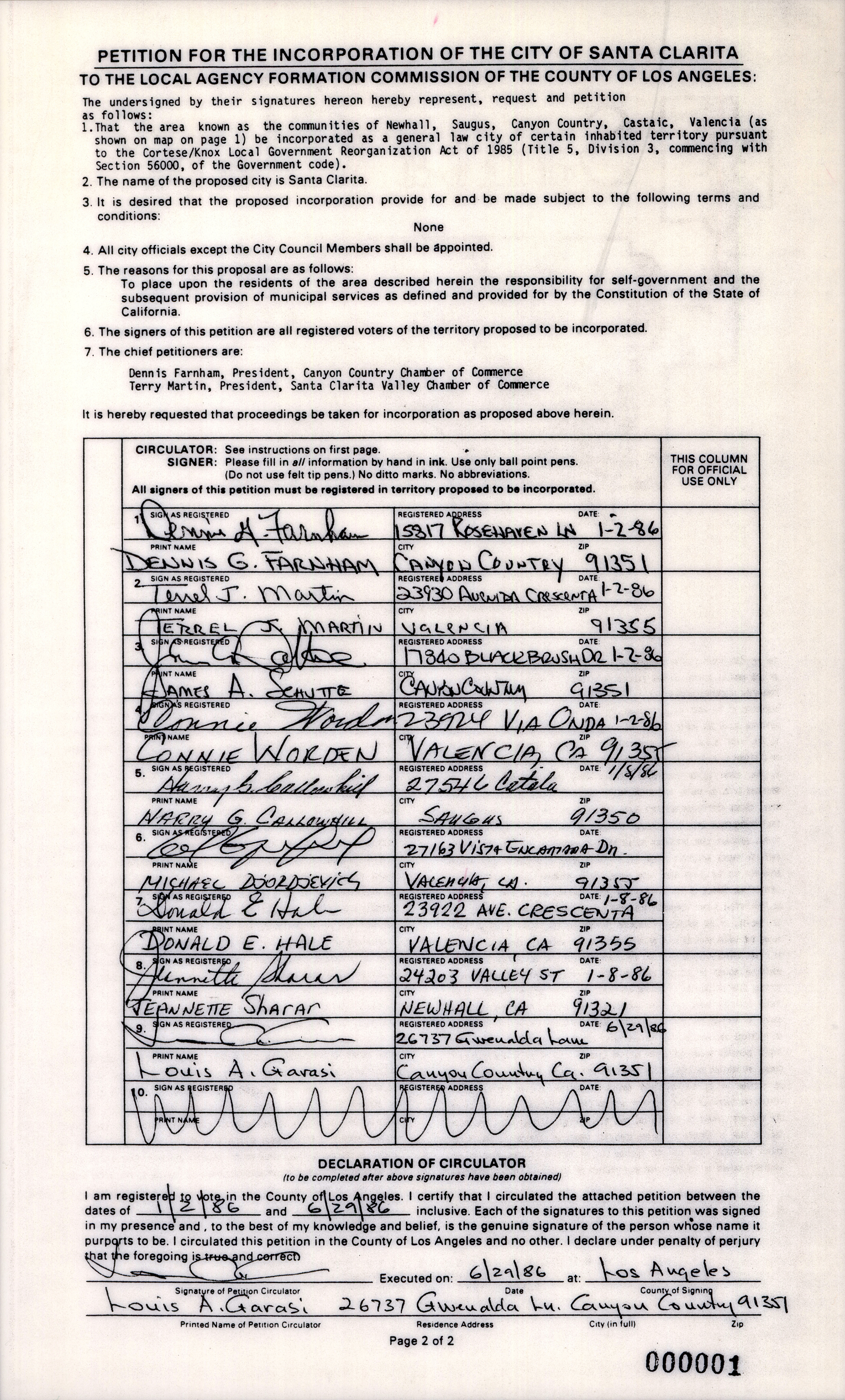 Petition No. 000001 for the incorporation of 90 square miles of the Santa Clarita Valley (including Castaic) as the City of Santa Clarita, circulated by Lou Garasi, 1986. Signatures from registered voters within the boundaries of the proposed city were required for LAFCO to process the cityhood request, which was necessary for the Los Angeles County Board of Supervisors to schedule the matter for a vote. (The election was conducted Nov. 3, 1987.)