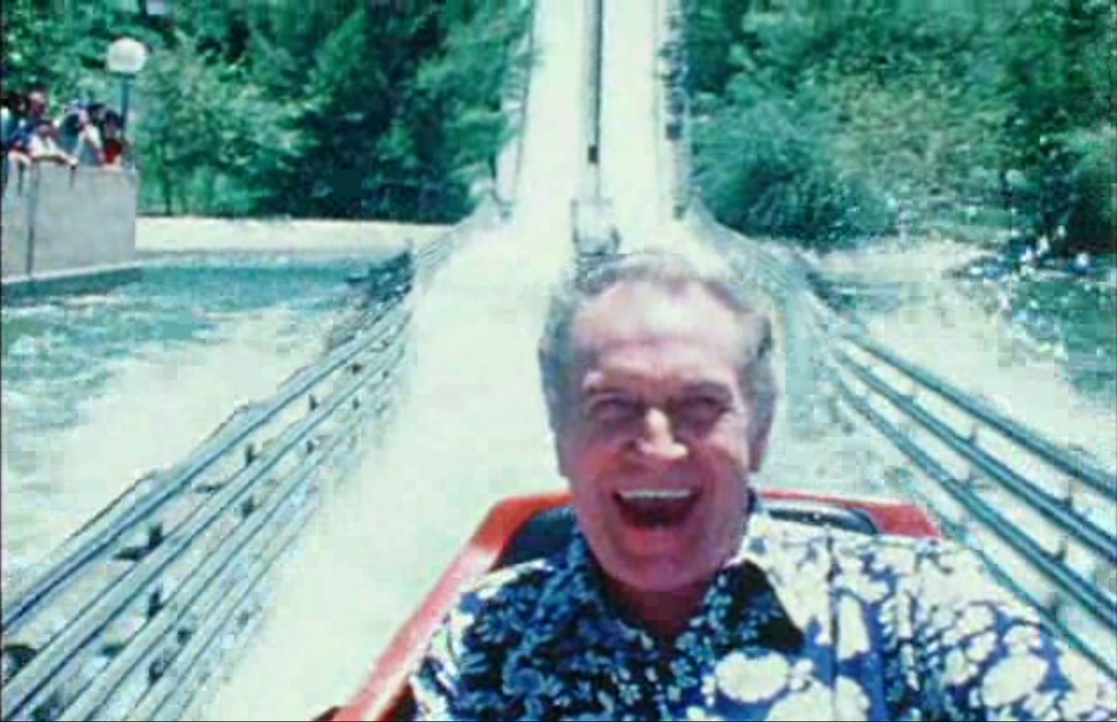 Actor Vincent Price (May 27, 1911 - Oct. 25, 1993) on the Jet Stream flume ride at Six Flags Magic Mountain, early 1980s.
