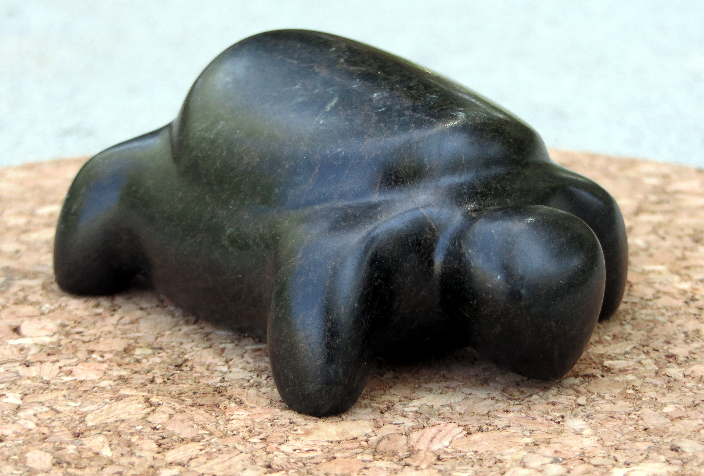 Turtle carving by Ted Garcia, ~2012. Steatite (Bouquet Stone) from Santa Clarita Valley, approx. 3x2¼x1½ inches. Artist's initials ("TG") inscribed in turtle's underside.