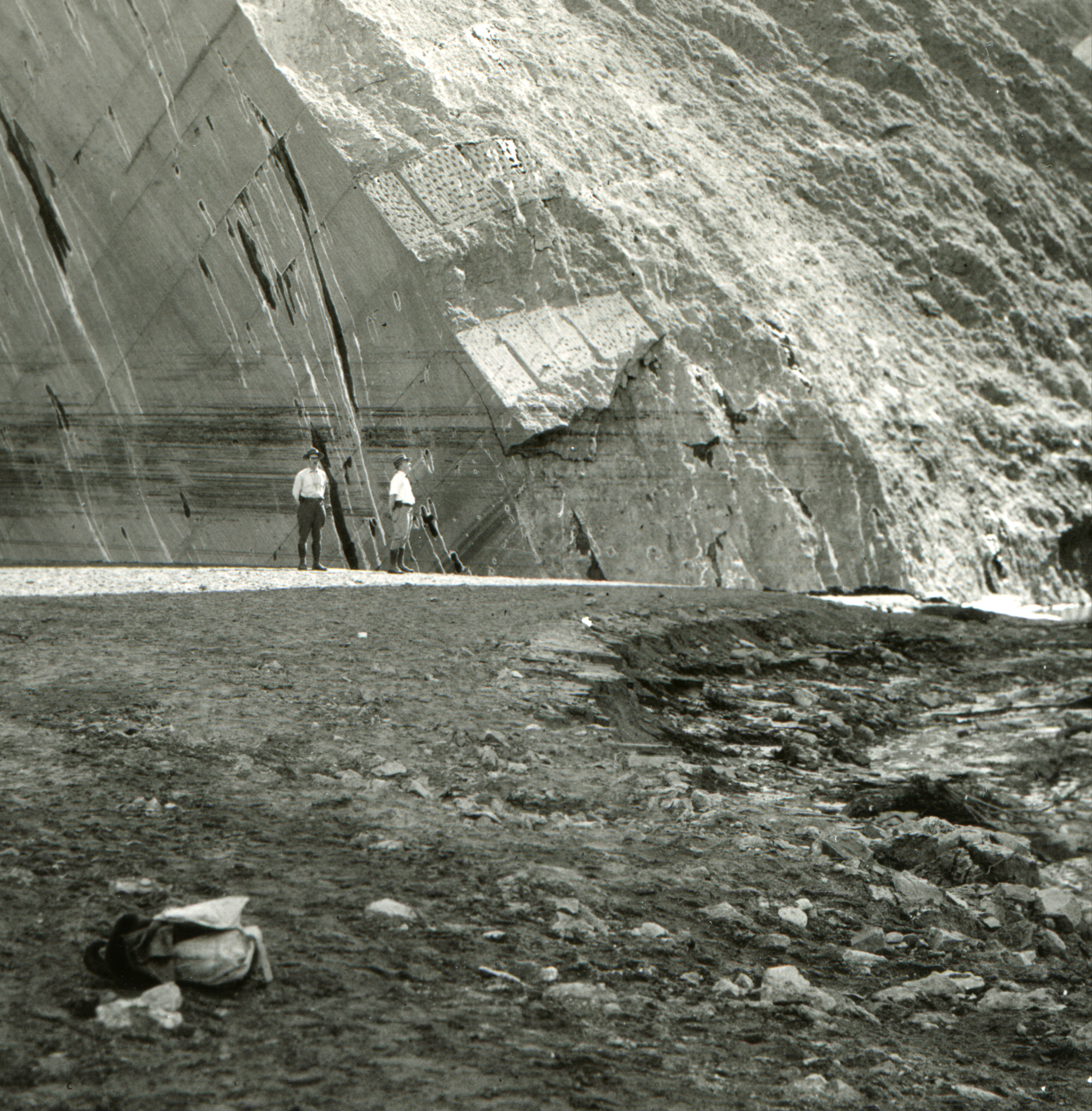 Unidentified persons inspect the north side (reservoir side) of the concrete St. Francis Dam in San Franciscquito Canyon after the break.