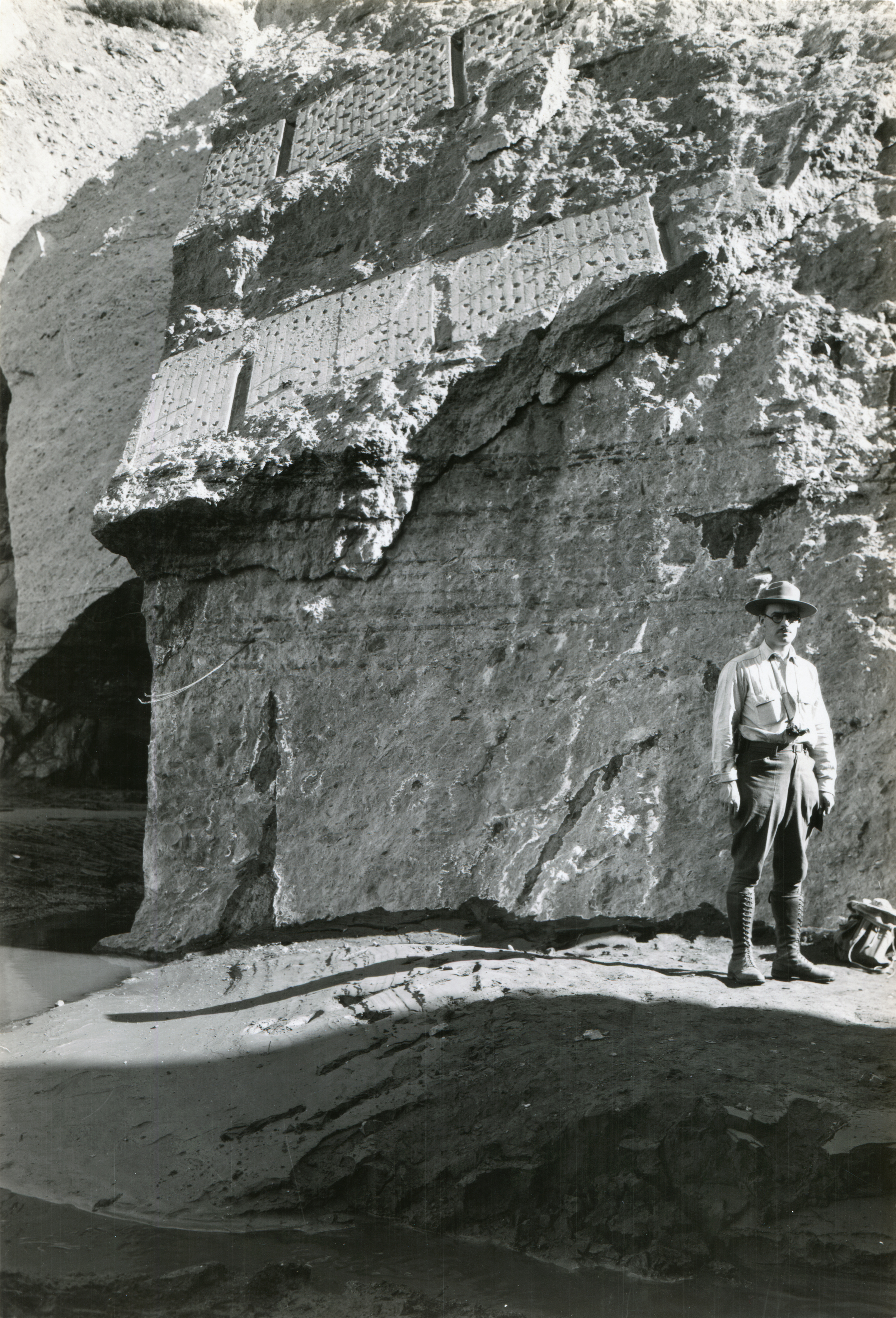 Unidentified man with backpack inspects the base of the St. Francis Dam after it failed.