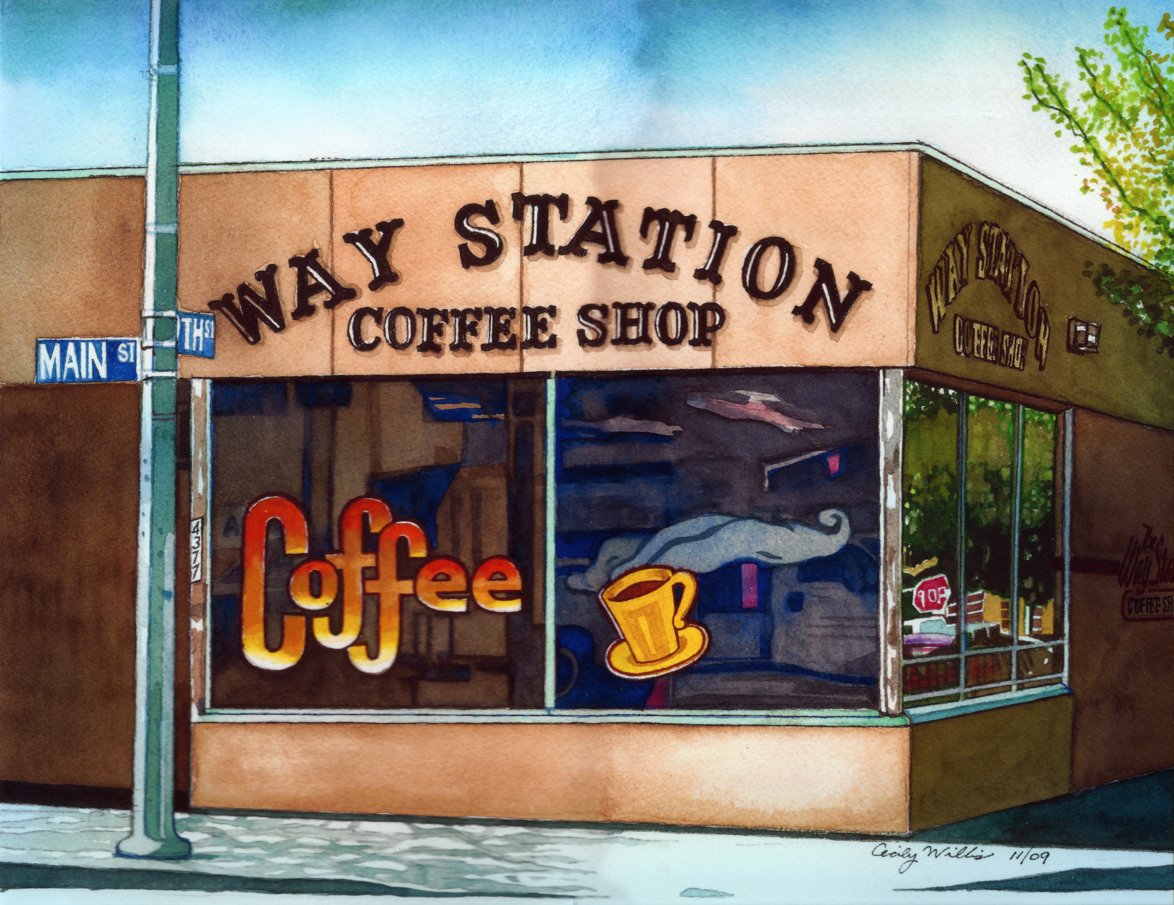 Way Station Coffee Shop in Newhall, corner Main Street & Ninth. Watercolor by Cecily Willis. 8x10 inches.