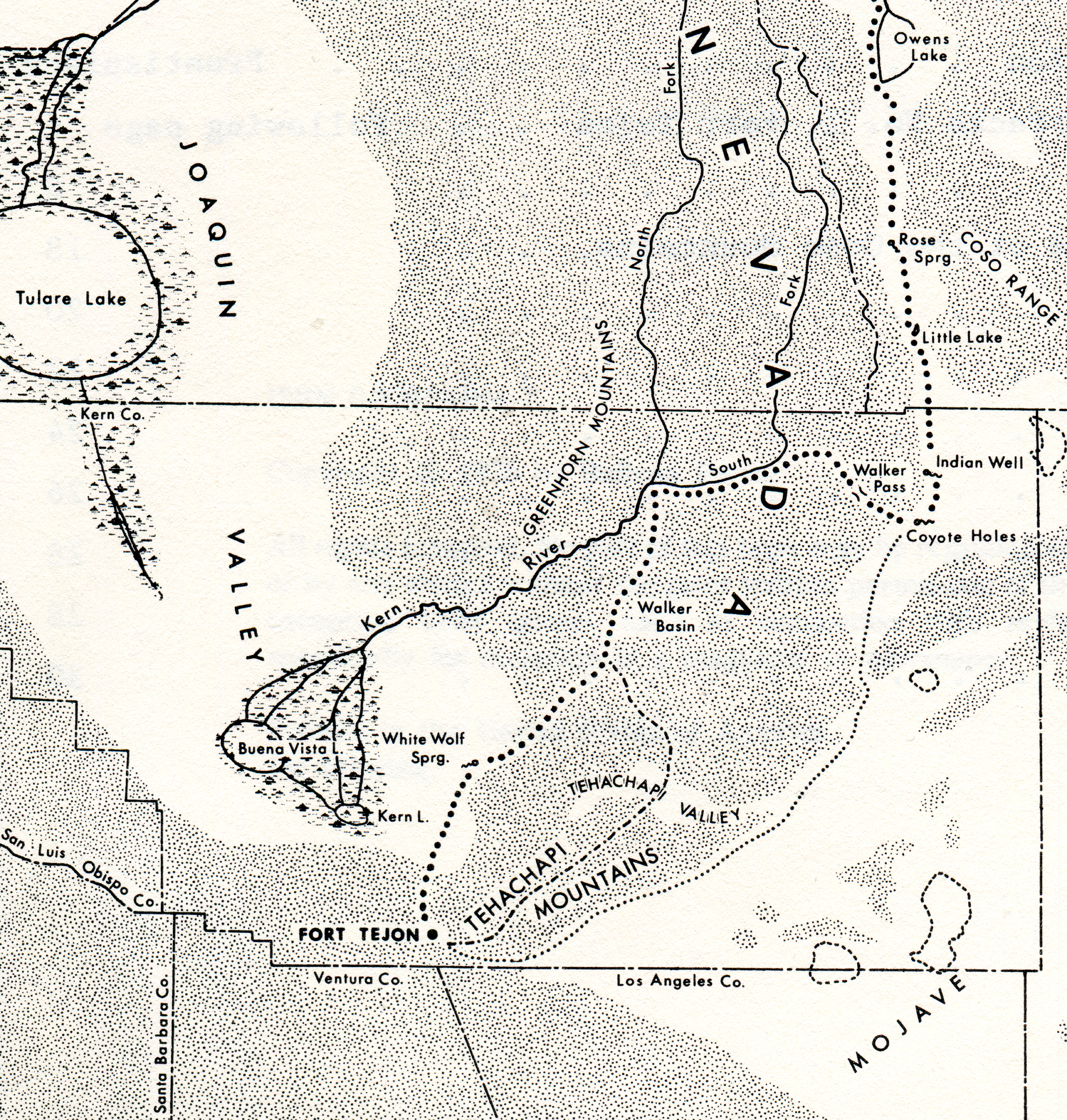 In 1854, Fort Tejon was established at a strategic point in Grapevine Canyon (Cañada de las Uvas), overlooking the southern end of the San Joaquin Valley. This canyon had become an important route for travel between the Los Angeles basin and the San Joaquin Valley by way of the present Tejon Pass. It was thought that much of the missing stock passed that way to the San Joaquin, and that the fort would help to curb losses. The fort was situated where a controlling influence could be exercised in what is now upper Antelope Valley, the western portion of the Mojave Desert, where it was thought the elusive Pah Utes surely took stolen horses. There was also a recognized need to protect Indians from the depredations of white settlers.