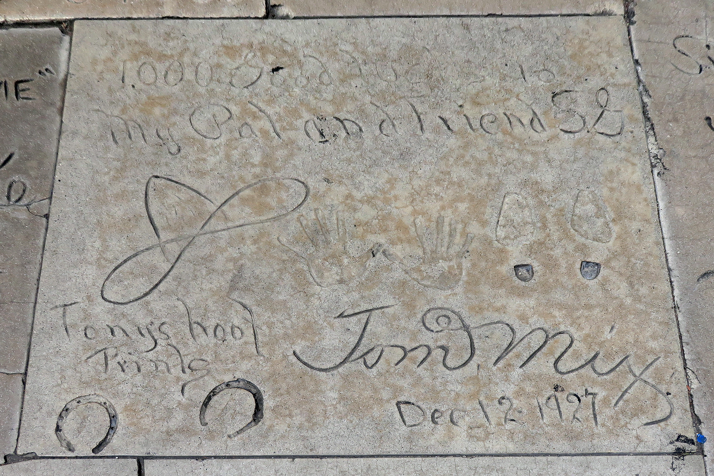 Handprints, footprints and hoof prints by Tom Mix and his Wonderhorse Tony at Sid Grauman's Chinese Theatre in Hollywood, December 12, 1927.