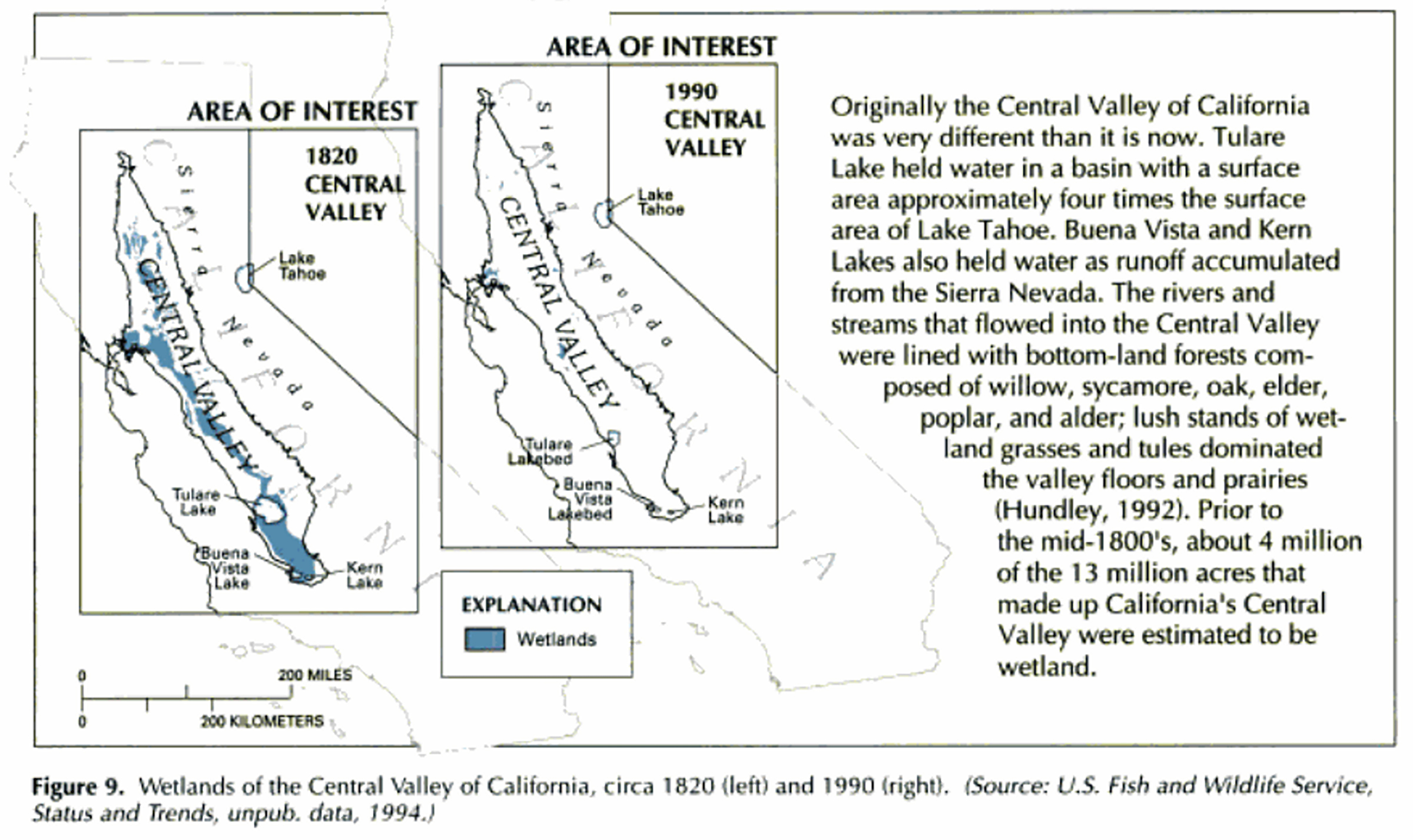 Now dry except for a small aquatic recreation area, Buena Vista Lake was a shallow freshwater lake in the southern San Joaquin Valley with a surface area that extended up to 150 square miles in wet years. It was fed by the Kern River. Dwarfed by Tulare Lake, it was nontheless the second largest of several lakes in the region. Tulare Lake (out of frame to the north of this USGS map) was the largest freshwater lake west of the Mississippi River before it was drained by American farmers in the late 1800s and early 1900s. Buena Vista Lake experienced a similar fate.
