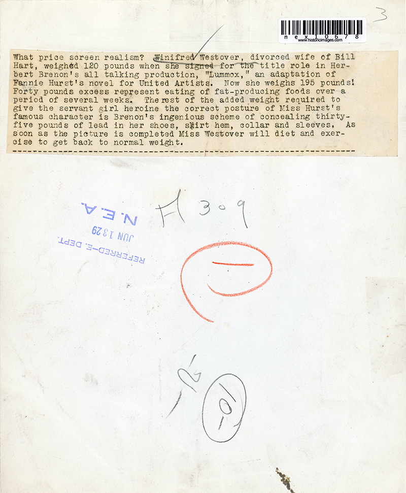Pre-release 8x10 publicity photograph shows what Winifred Westover, the ex-Mrs. William S. Hart, went through to make her short-lived screen comeback in Herbert Brenon's 1930 adaptation of the 1923 Fannie Hurst novel, "Lummox."