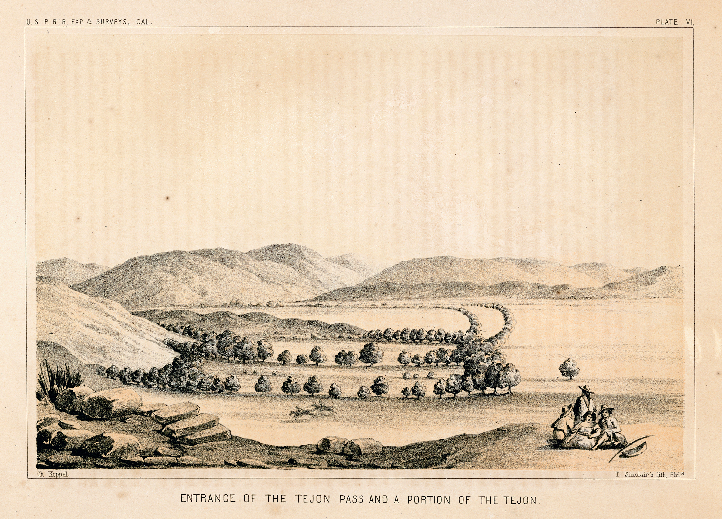 "Entrance of the Tejon Pass and a Portion of the Tejon." Original lithograph, 6x9 inches (full page 9x12 inches). From field sketch by Charles Koppel in 1853, lithograph by Thomas S. Sinclair of Philadelphia, printed by U.S. Government Printing Office, 1856. Plate VI from Part 1 of Vol. 5 of "Reports of Explorations and Surveys, to ascertain the most practicable and economical route for a railroad from the Mississippi River to the Pacific Ocean, made under the direction of the Secretary of War, in 1853-4, According to Acts of Congress of March 3, 1853, May 31, 1854, and August 5, 1854."