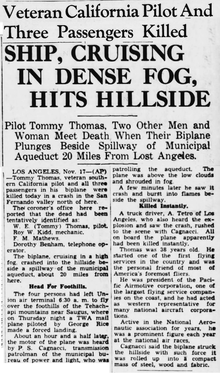 All persons on board — prominent pilot Tommy Thomas and three of his employees — are killed when Thomas' Waco Model-C biplane, tail No. NC-13065, crashes against a mountain near Newhall while they were searching for the wreckage of a non-fatal plane crash from 2 days prior.