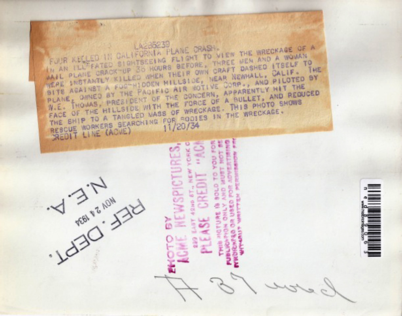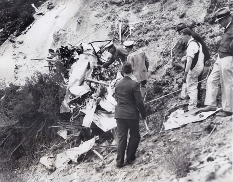 In an ill-fated sightseeing flight to view the wreckage of a mail plane crack-up 36 hours before, three men and a woman were instantly killed when their own craft dashed itself to bits against a fog-hidden hillside near Newhall, Calif. The plane, owned by the Pacific Air Motive Corp., and piloted by W.E. Thomas, president of the concern, apparently hit the face of the hillside with the force of a bullet, and reduced the ship to a tangled mass of wreckage. This photo shows rescue workers searching for bodies in the wreckage.