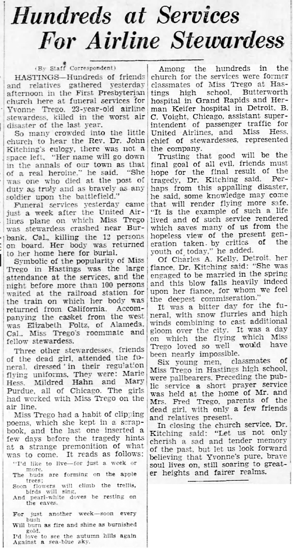 Among the hundreds in the church for the services were former classmates of Miss Trego at Hastings high school, Butterworth hospital in Grand Rapids and Herman Keifer hospital in Detroit. B.C. Voight, Chicago, assistant superintendent of passenger traffic for United Airlines, and Miss Hess, chief of stewardesses, represented the company.