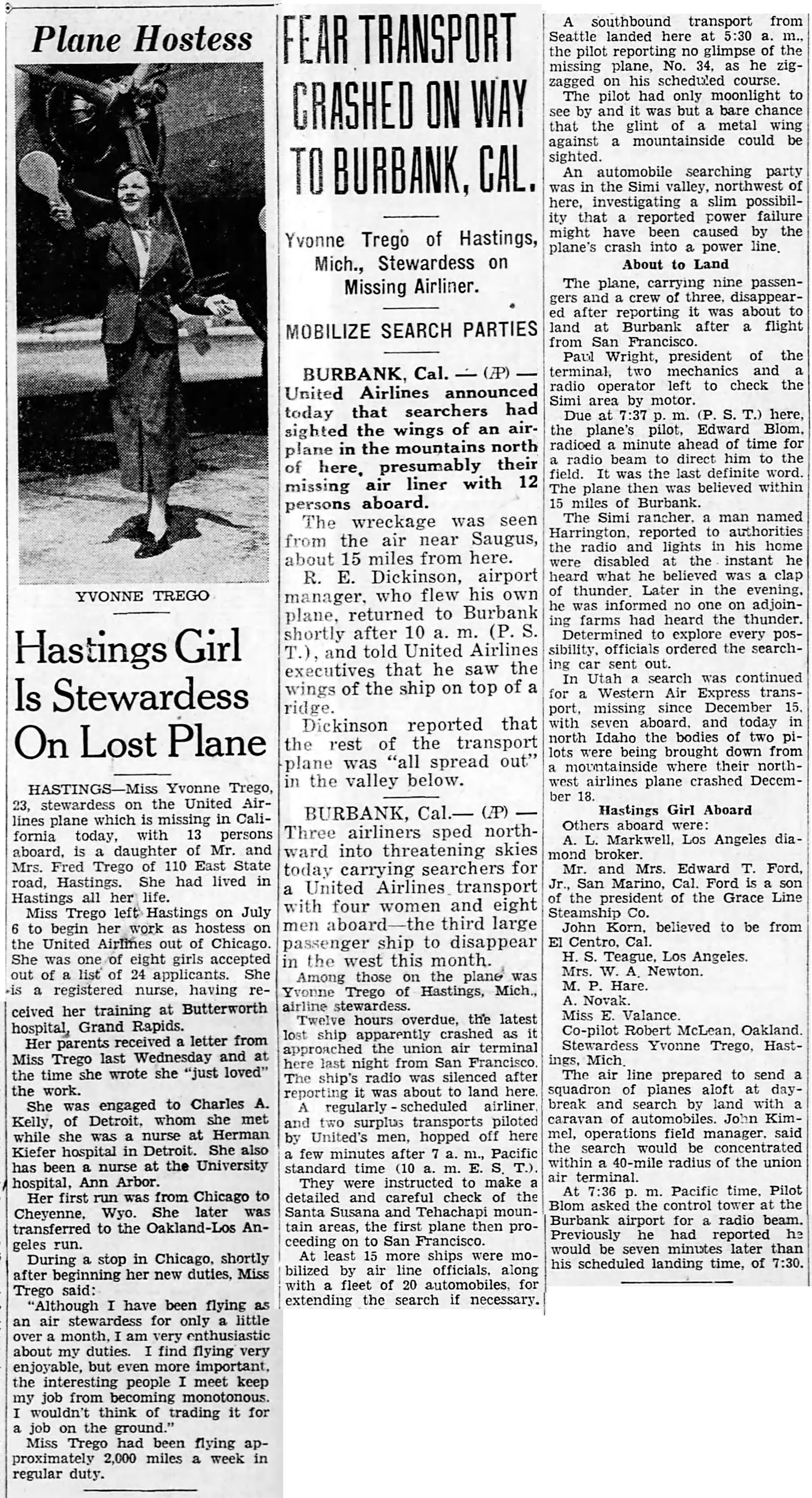 Among those on the plane was Yvonne Trego of Hastings, Mich., airline stewardess.