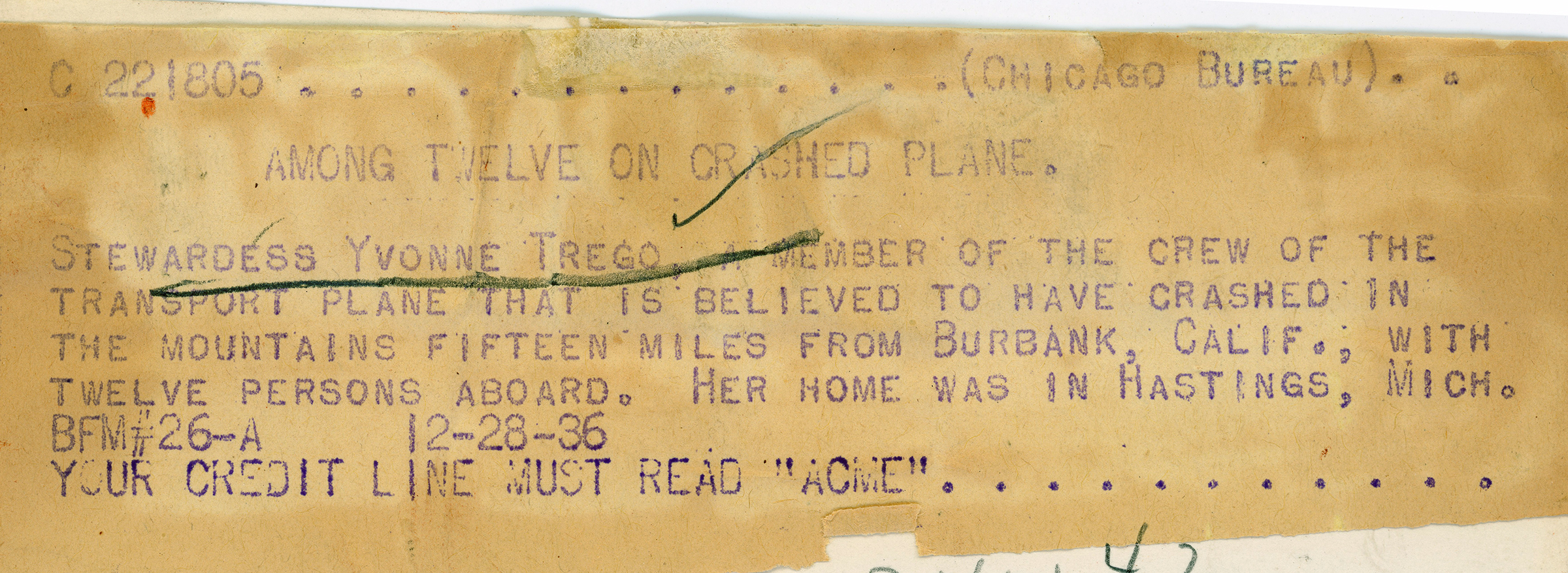 Stewardess Yvonne Trego perished in the crash of United Flight 34 on a mountaintop south of Newhall Dec. 27, 1936. All three crew members and nine passengers were killed.