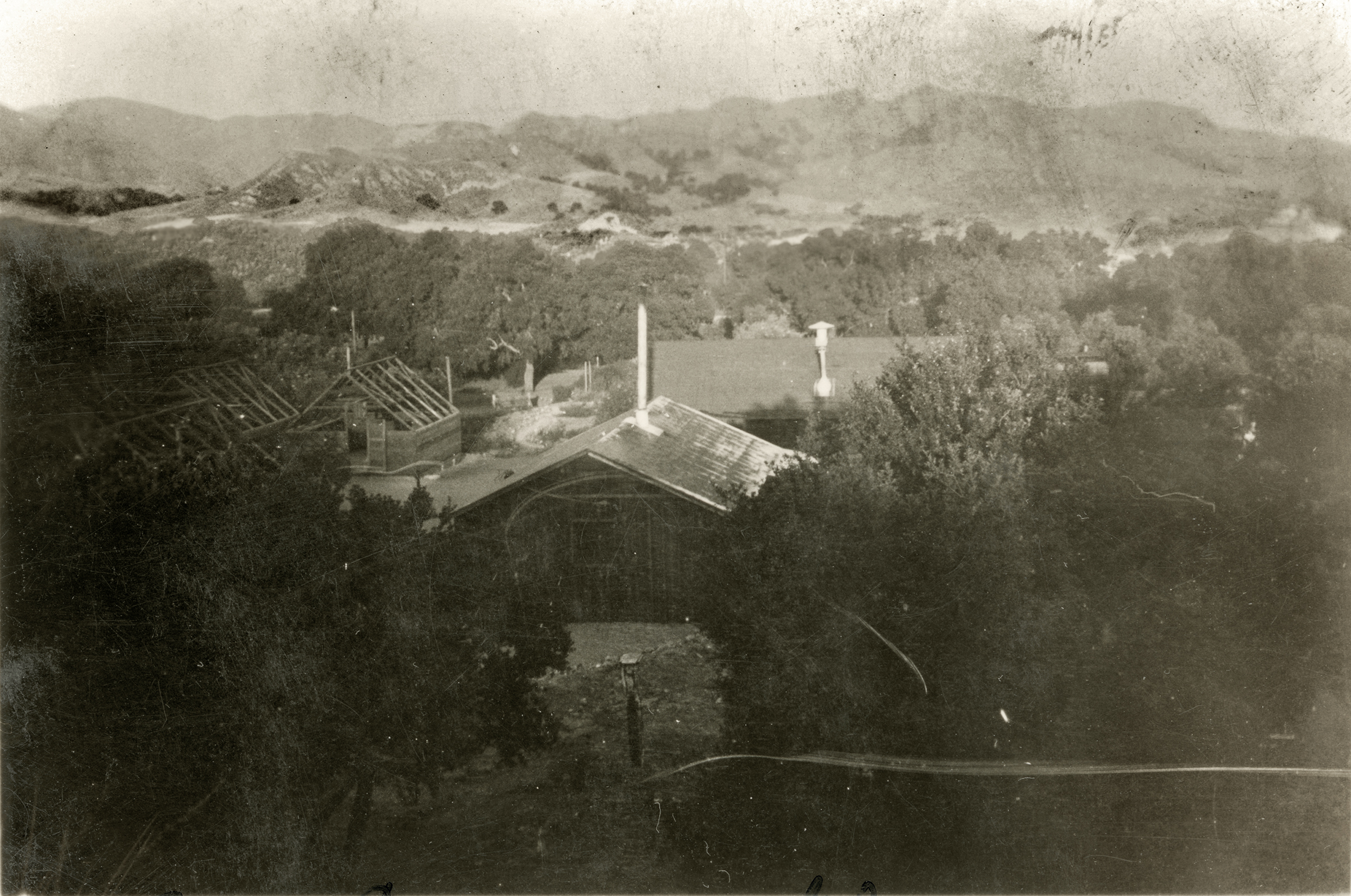Handwriting on front margin and back of photograph reads: "Skeleton of tents in Bear Canyon / Saugus, Cal. / 1936."