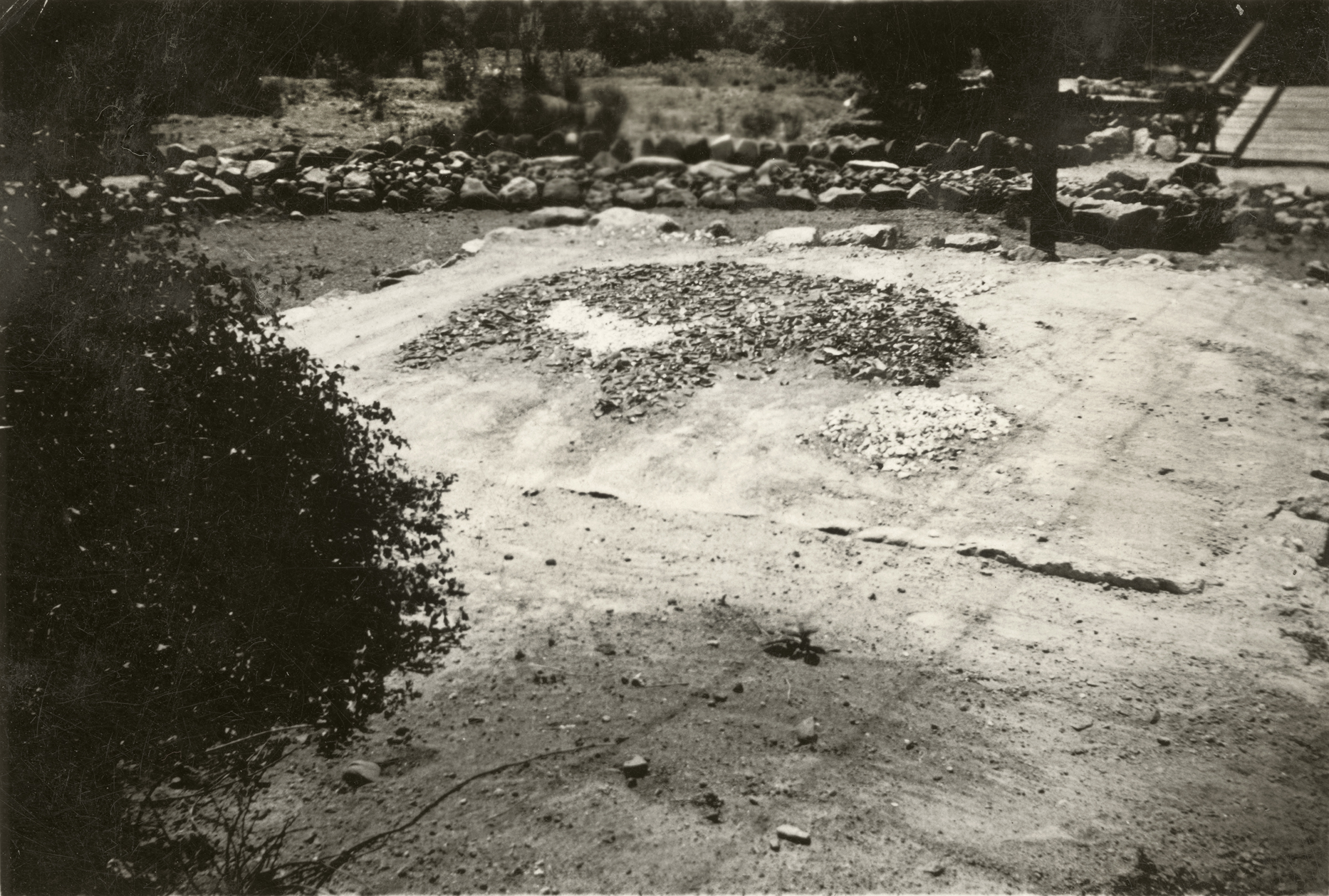 Handwriting on back of photograph reads: "A picture insignia of the Bear made of colored glass / Saugus, California." Print date-stamped Feb. 3 (no year).