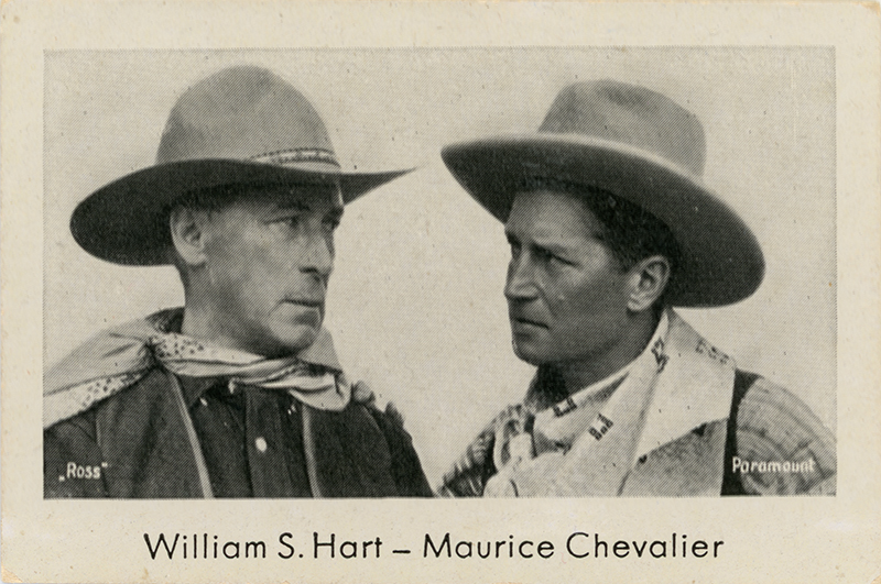 Tobacco card issued by Ross Verlag, advertising the Paramount stars William S. Hart (1864-1946) and Maurice Chevalier (1888-1972). 1½ x 2¼ inches, for insertion into a pack of