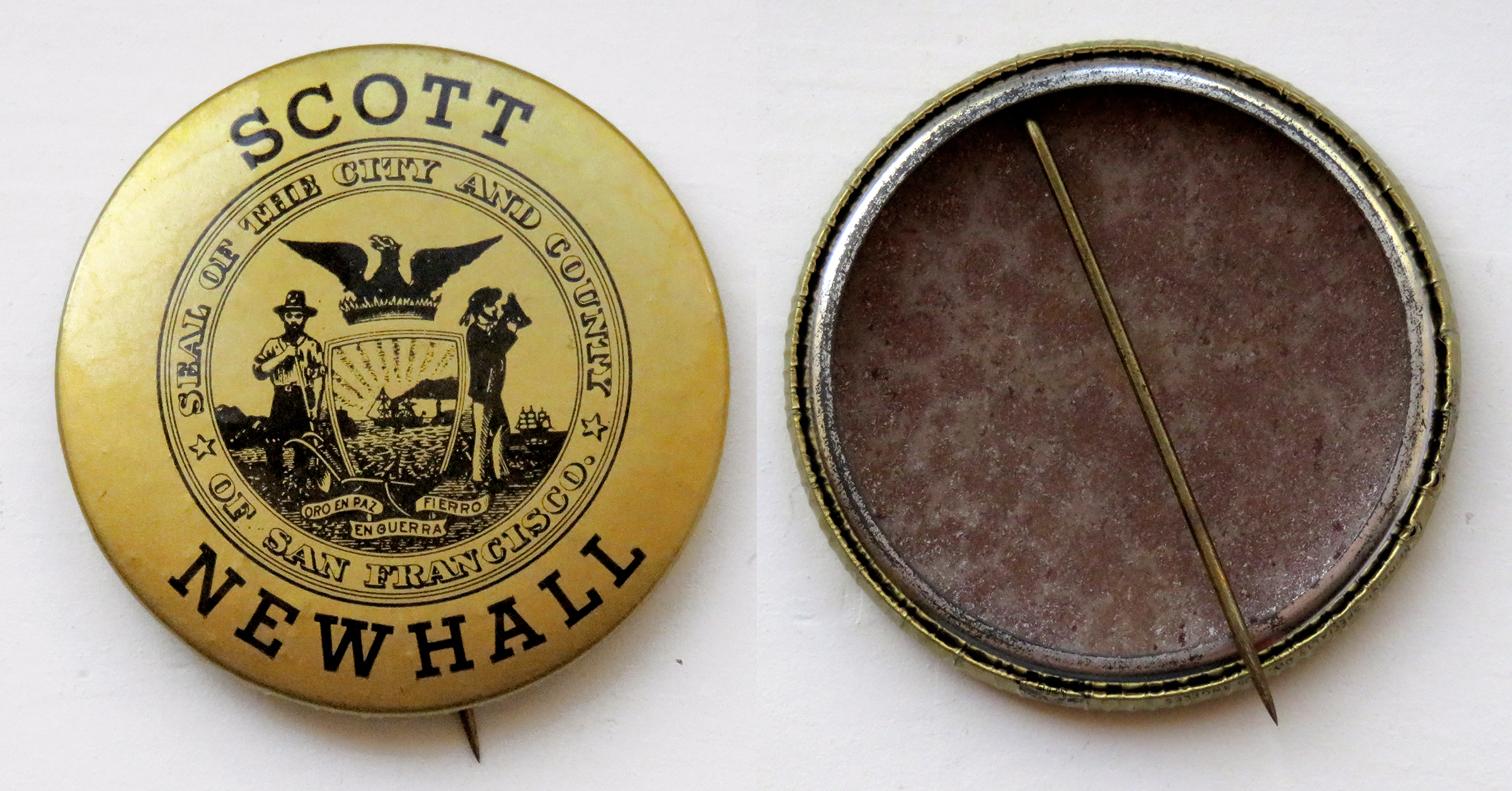 Pinback, gold and black, 52.5mm (2-1/16 inches), 1971. Scott Newhall / Seal of the City and County of San Francisco.