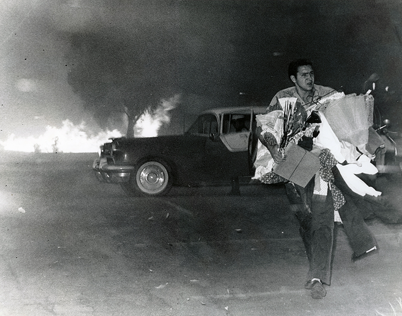 August 28, 1962 — Near Olive View Sanitarium in Sylmar, a man flees from a fast-moving fire that started earlier in the day at Circle J Ranch and