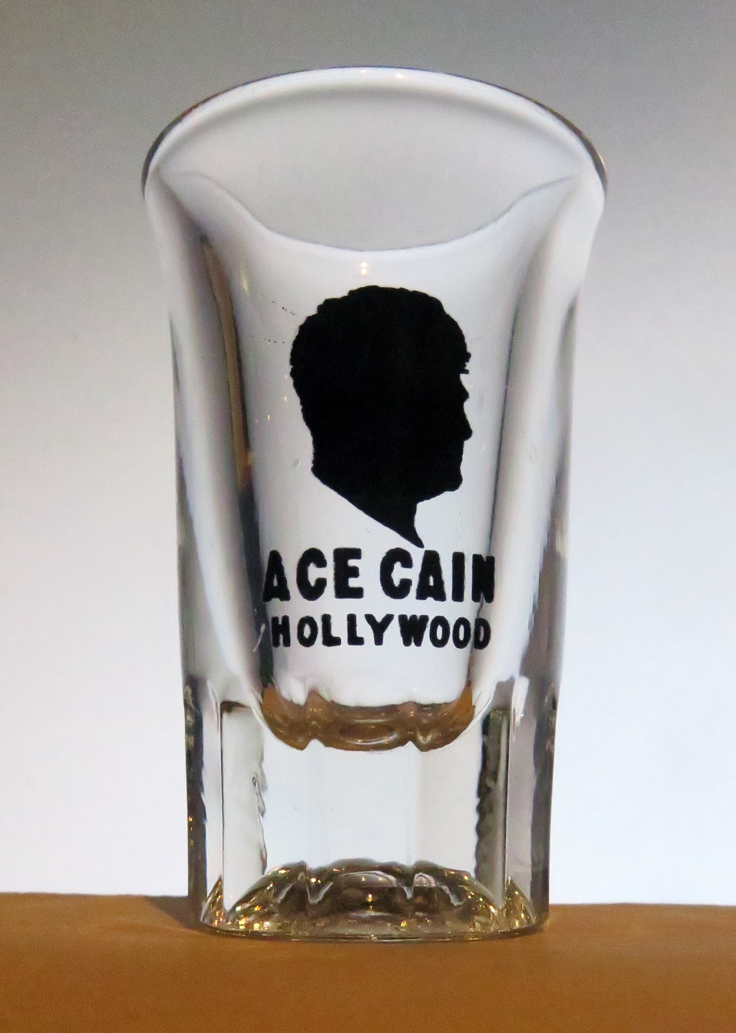Shot glass from actor Ace Cain's Hollywood nightclub, 1369 N. Western Ave., 1940s. Measures 2¾x1¾ inches at rim.
