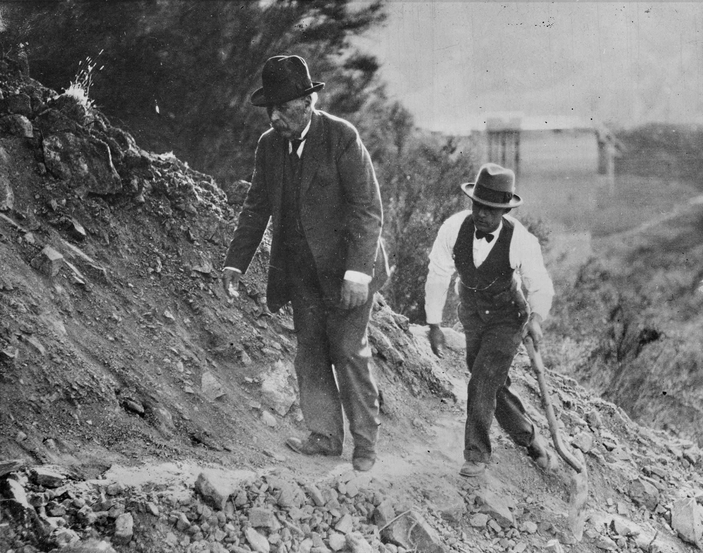 According to the file card, the man carrying the shovel is Mulholland's assistant, Harvey A. Van Norman. But St. Francis Dam historian Don Ray says it is