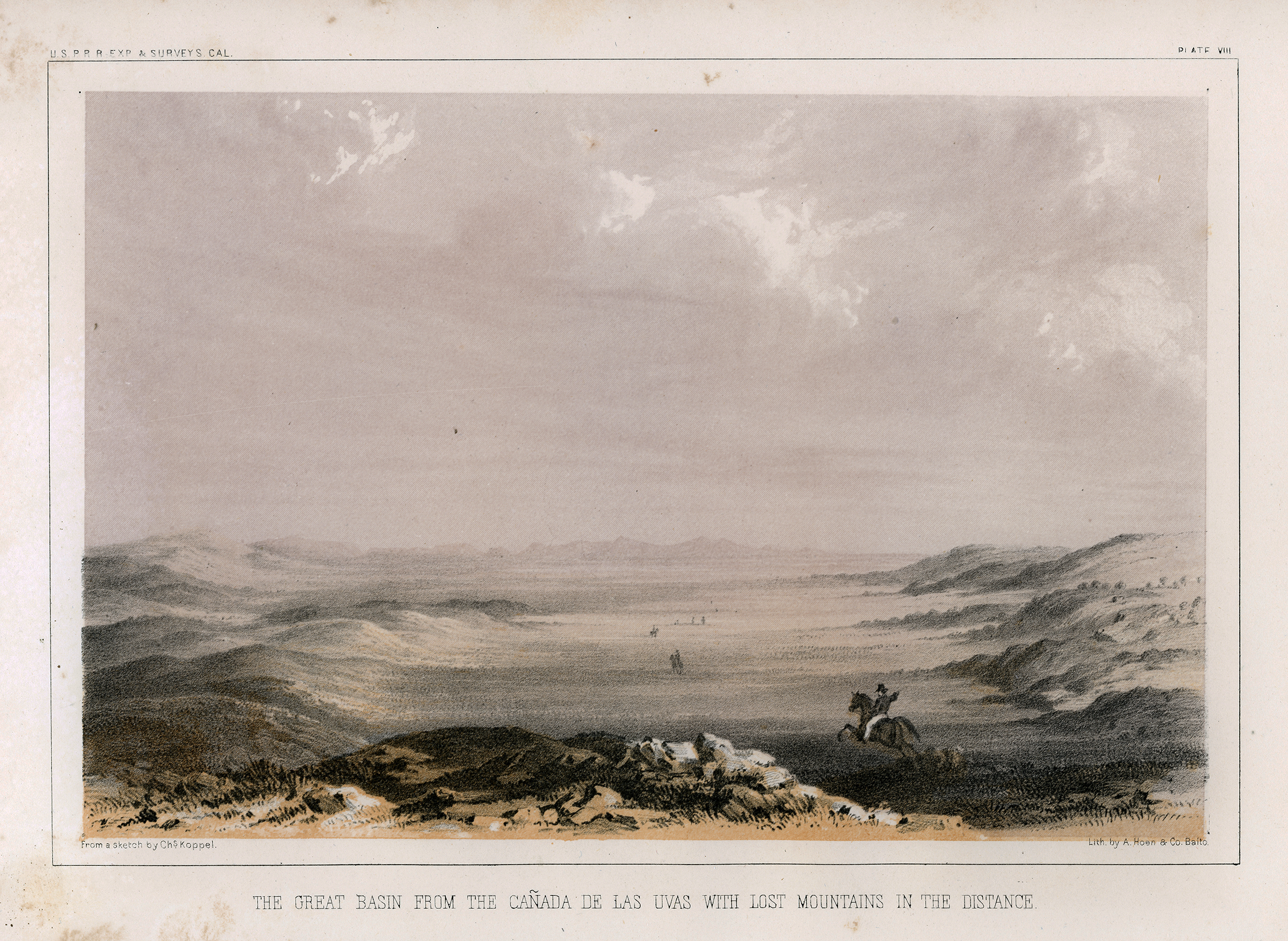 Original lithograph, 6x9 inches (full page 9x12 inches). From field sketch by Charles Koppel in 1853; lithograph by A Hoen & Company of Baltimore; printed by U.S. Government Printing Office, 1856. Plate VIII from Part 1 of Vol. 5 of "Reports of Explorations and Surveys, to ascertain the most practicable and economical route for a railroad from the Mississippi River to the Pacific Ocean, made under the direction of the Secretary of War, in 1853-4, According to Acts of Congress of March 3, 1853, May 31, 1854, and August 5, 1854."