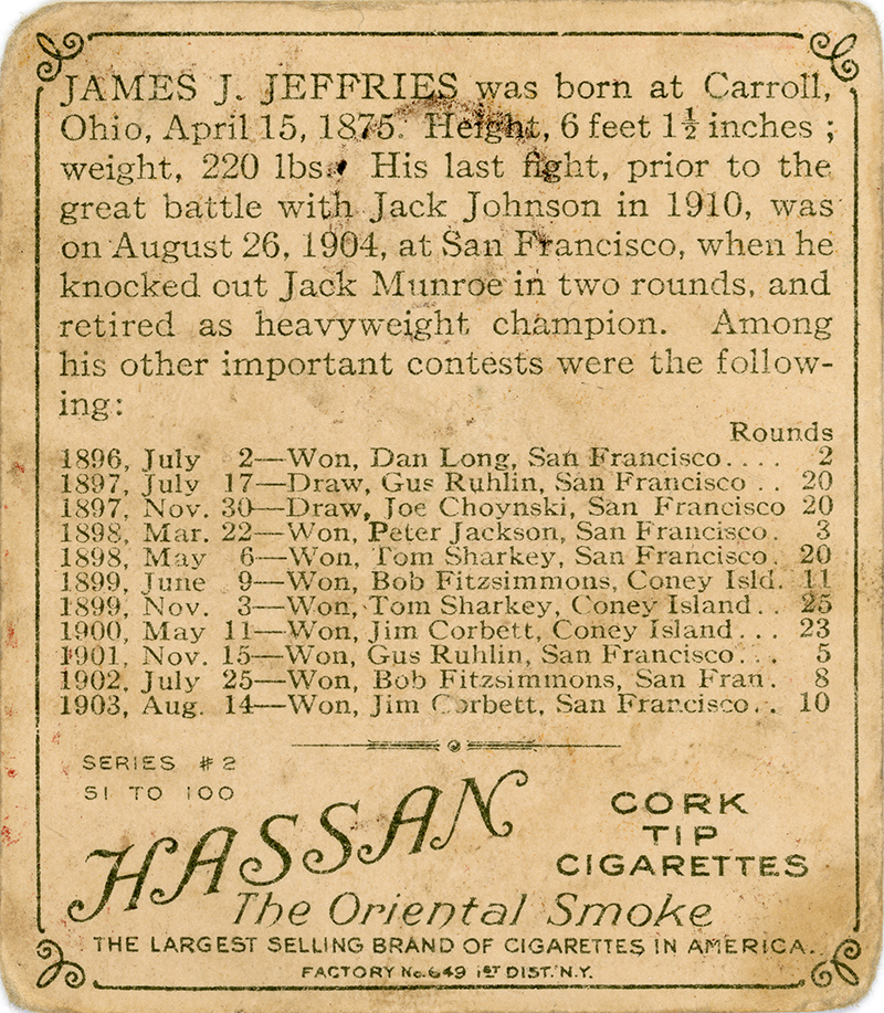 Nicknamed the Boilermaker, Jeffries (1875-1953) was the heavyweight champion of the world from 1899-1904. He seized the title with an 11th-round knockout of reigning champion Bob Fitzsimmons in Brooklyn