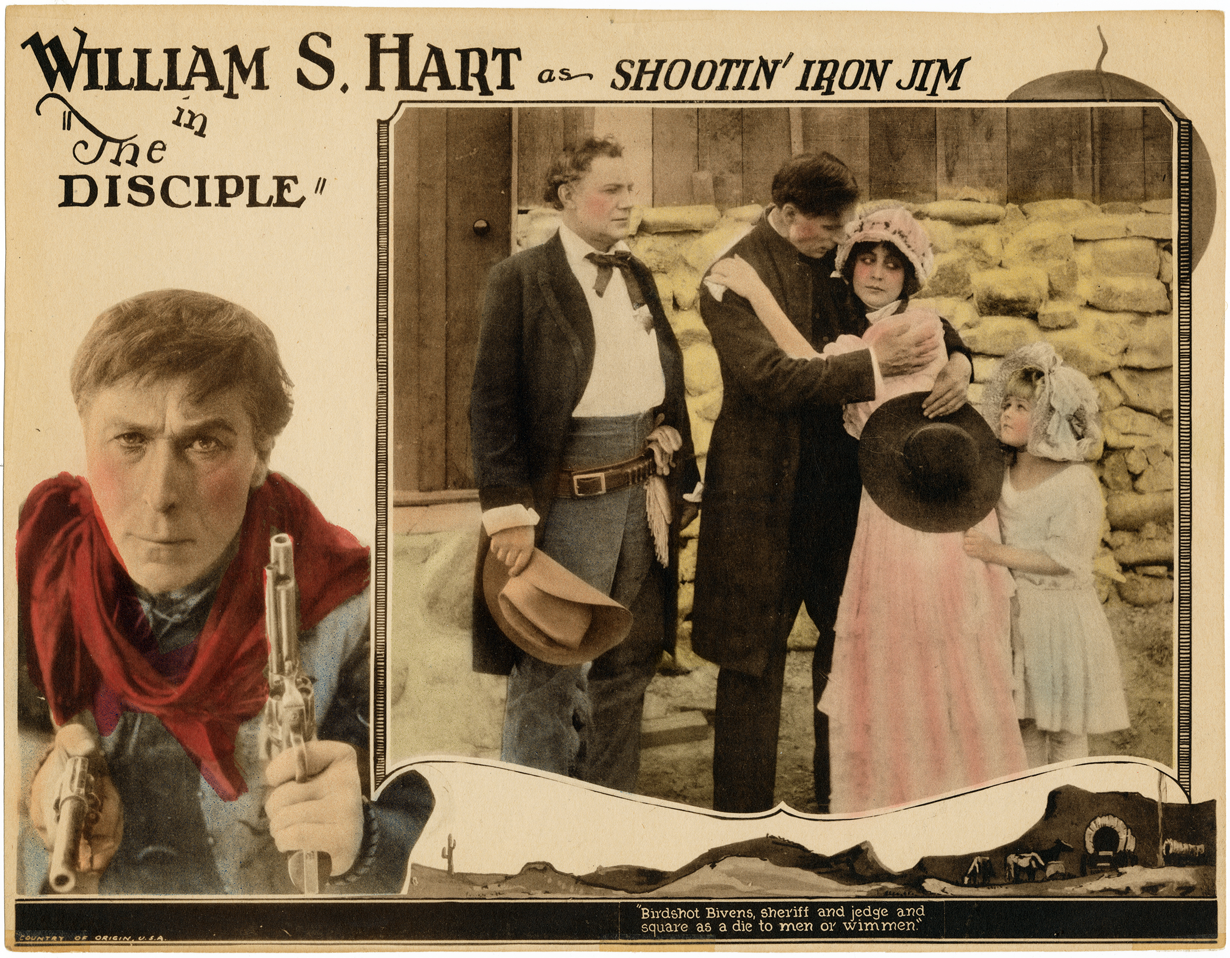 Lobby card advertising William S. Hart as Shootin' Iron Jim in "The Disciple" from Kay-Bee Pictures, originally distributed by Triangle in 1915.