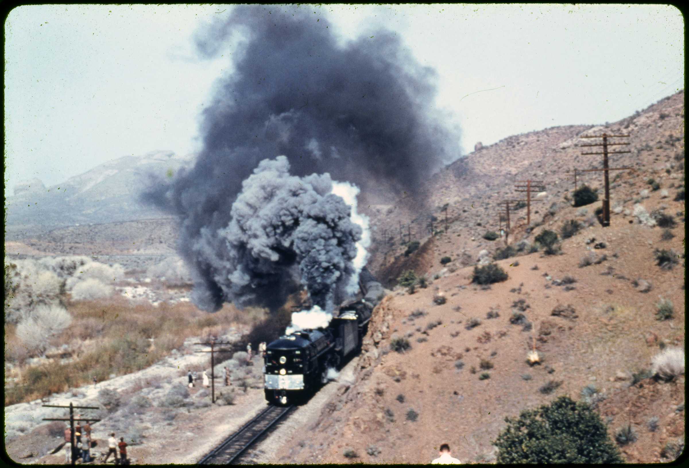 Southern Pacific cab-forward locomotive No. 4202 steams through Soledad Canyon near Ravenna (between Lang and Acton) in this undated 1940s or 1950s photograph