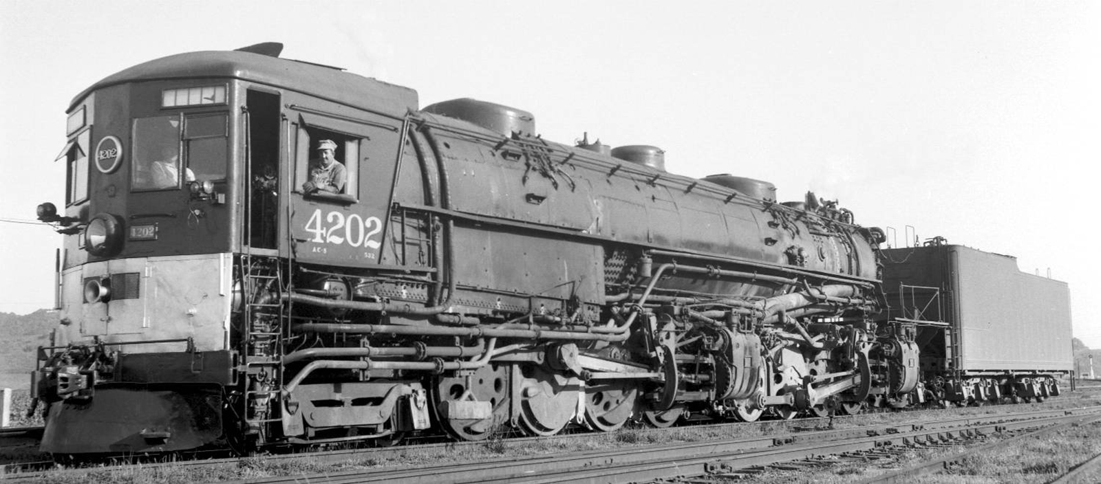 Engine No. 4202 was built by Baldwin Locomotive Works in 1939. It was a Class AC-8, the fifth of the 4-8-8-2 classes, which came with bigger windows than its predecessors as a standard feature.