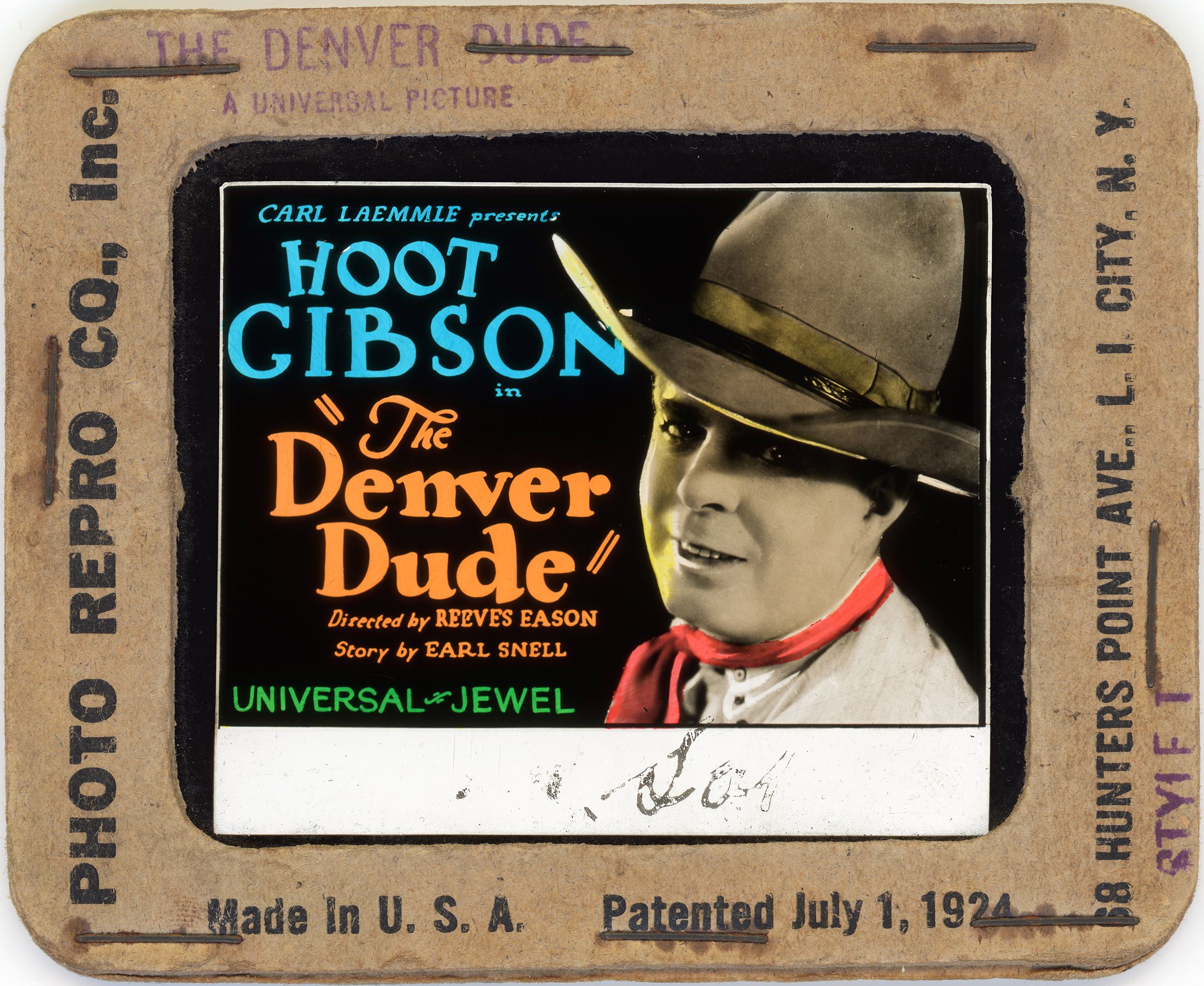 We don't know where it was shot — and we may never know, because we can't see it. "The Denver Dude" is a lost film. Like more than half of the silent movies ever made, it no longer exists. All we have are some of the advertising materials for it such as this magic lantern slide. (Today we have movie trailers to promote coming attractions; back then they had magic lantern slides.)
