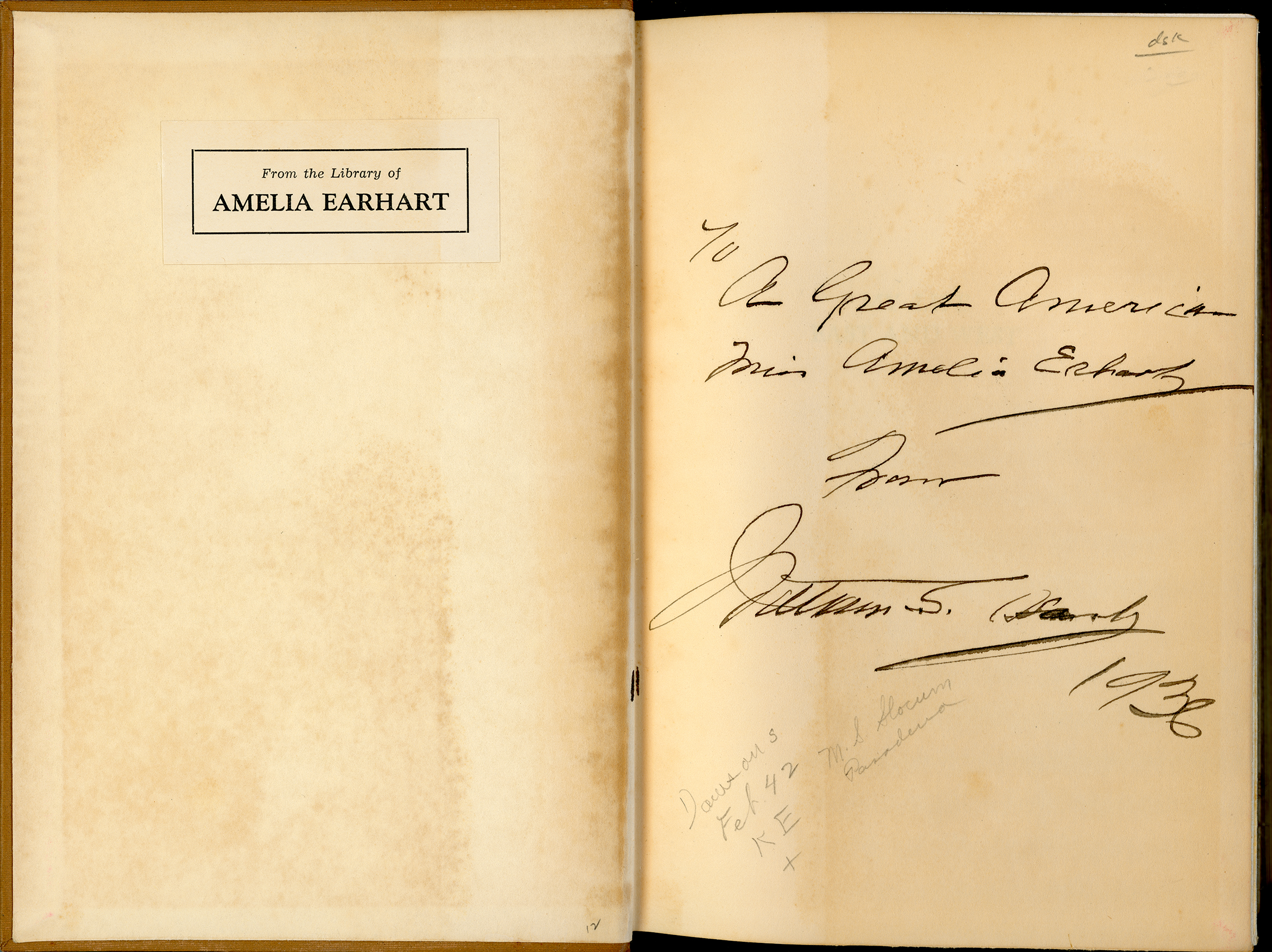 We do know she received it, because it's got her bookplate in it: "From the Library of Amelia Earhart." At some point fairly early after her disappearance, it ended up in the library of Miles Standish Slocum, a prominent Pasadena book collector who focused on the literature and history of the American West. After Slocum's death in 1956, it passed down eventually to his granddaughter.[7]