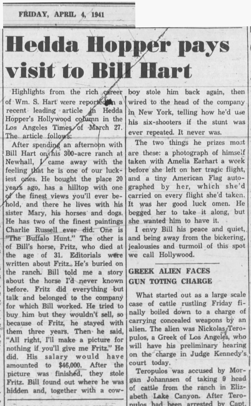 Hart was "among [the] friends in California whom AE liked most," Putnam writes, and the sentiment was clearly mutual. Columinst Hedda Hopper wrote in 1941 that Hart counted a photograph of himself with Earhart, and a small American flag she gave him, as his most prized possessions.[2]
