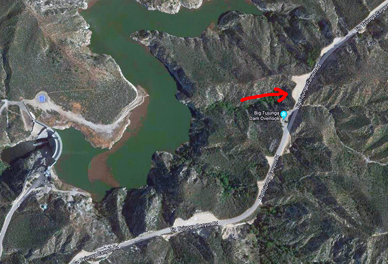 The scene shown here was staged on Big Tujunga Canyon Road (see map below) just west of Angeles Forest Highway, overlooking the Big Tujunga Reservoir that is impounded by