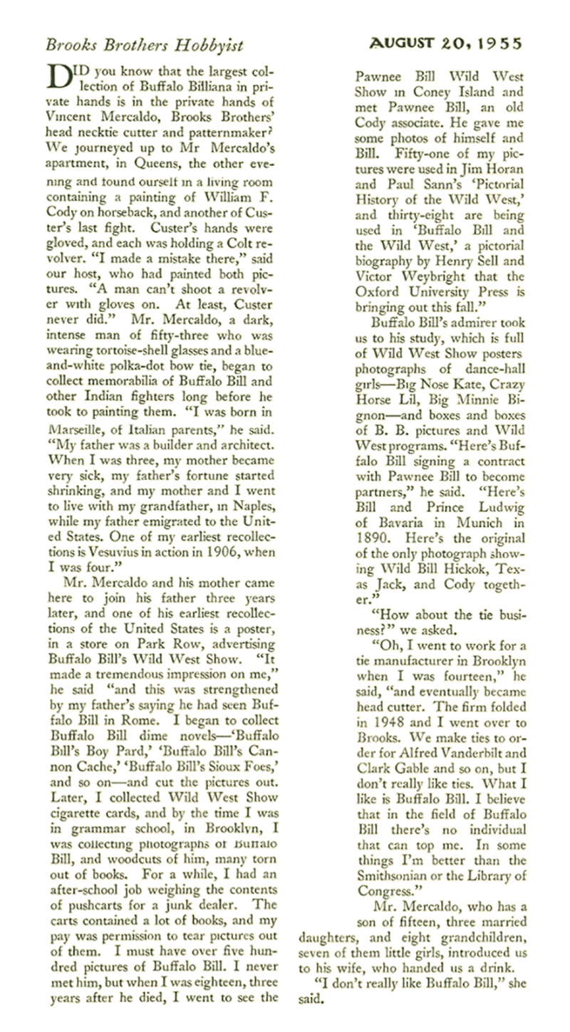 Did you know that the largest collection of Buffalo Billiana in private hands is in the private hands of Vincent Mercaldo, Brooks Brothers' head necktie cutter and patternmaker? We journeyed up to Mr. Mercaldo's apartment in Queens the other evening and found ourself in a living room containing a painting of William F. Cody on horseback, and another of Custer's last fight. Custer's hands were gloved, and each was holding a Colt revolver.