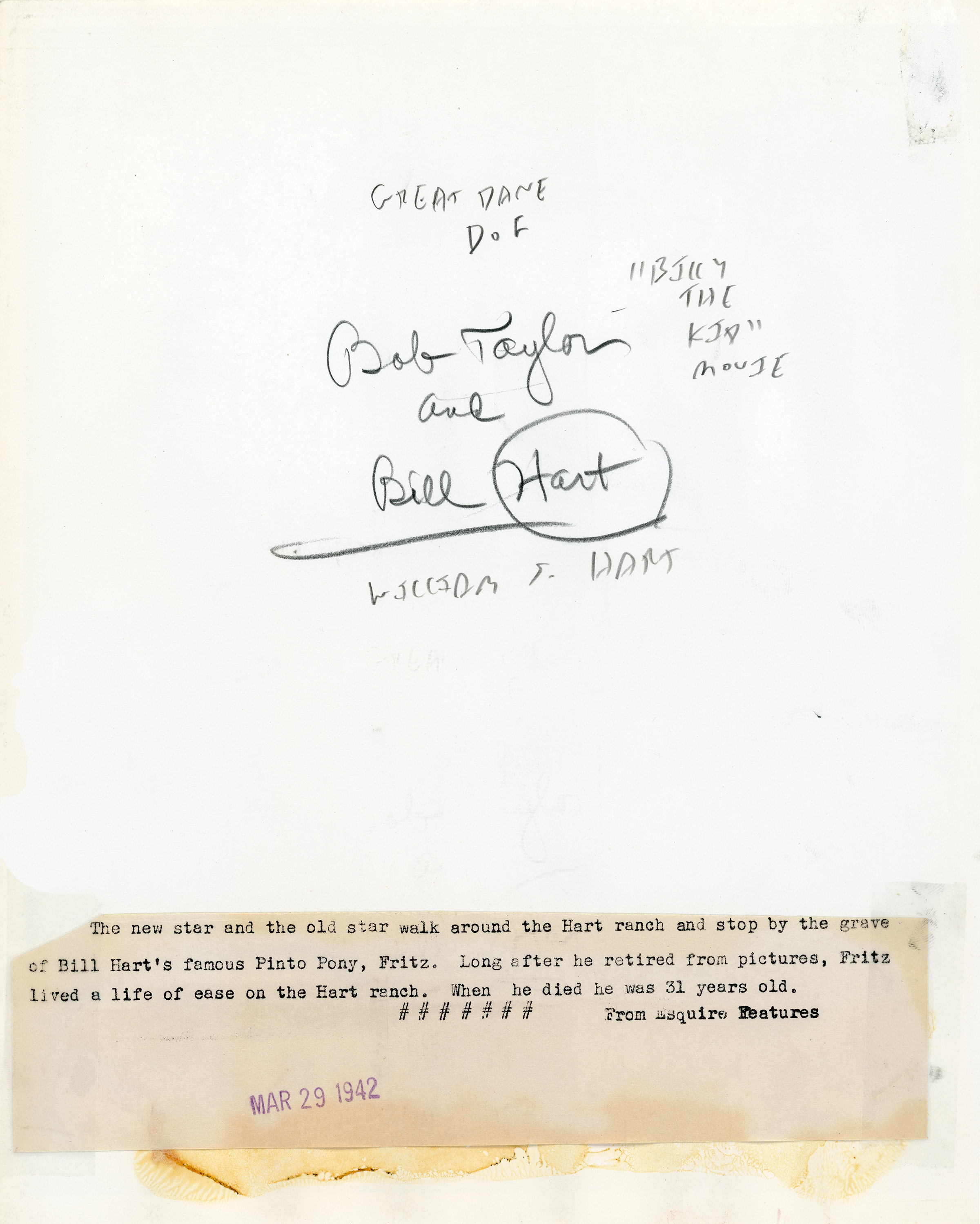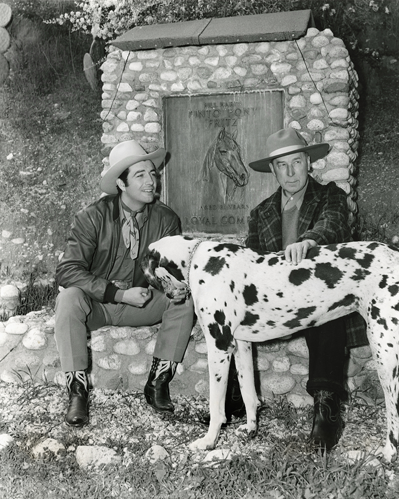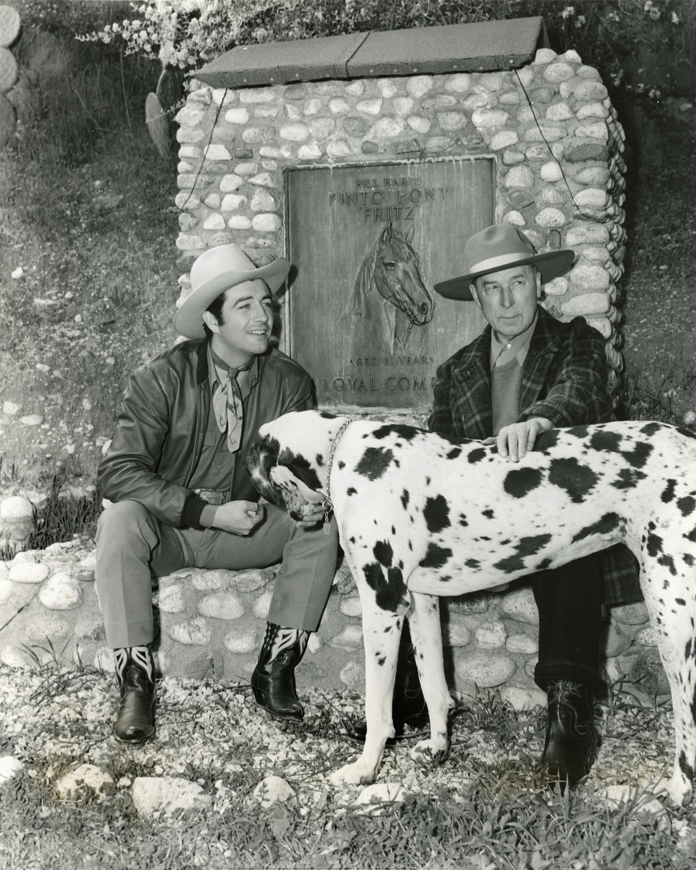Actor Robert Taylor, left, star of the upcoming MGM feature film, "Billy the Kid" (1941), poses for publicity photographs with a steely-eyed William S. Hart at the grave of Hart's famous horse, Fritz, at Hart's Horseshoe Ranch in Newhall, where they're joined by one of Hart's twin harlequin Great Danes, either Gal or Prince (apparently Gal). Both dogs appear in at least one other photo made at the same time and place.