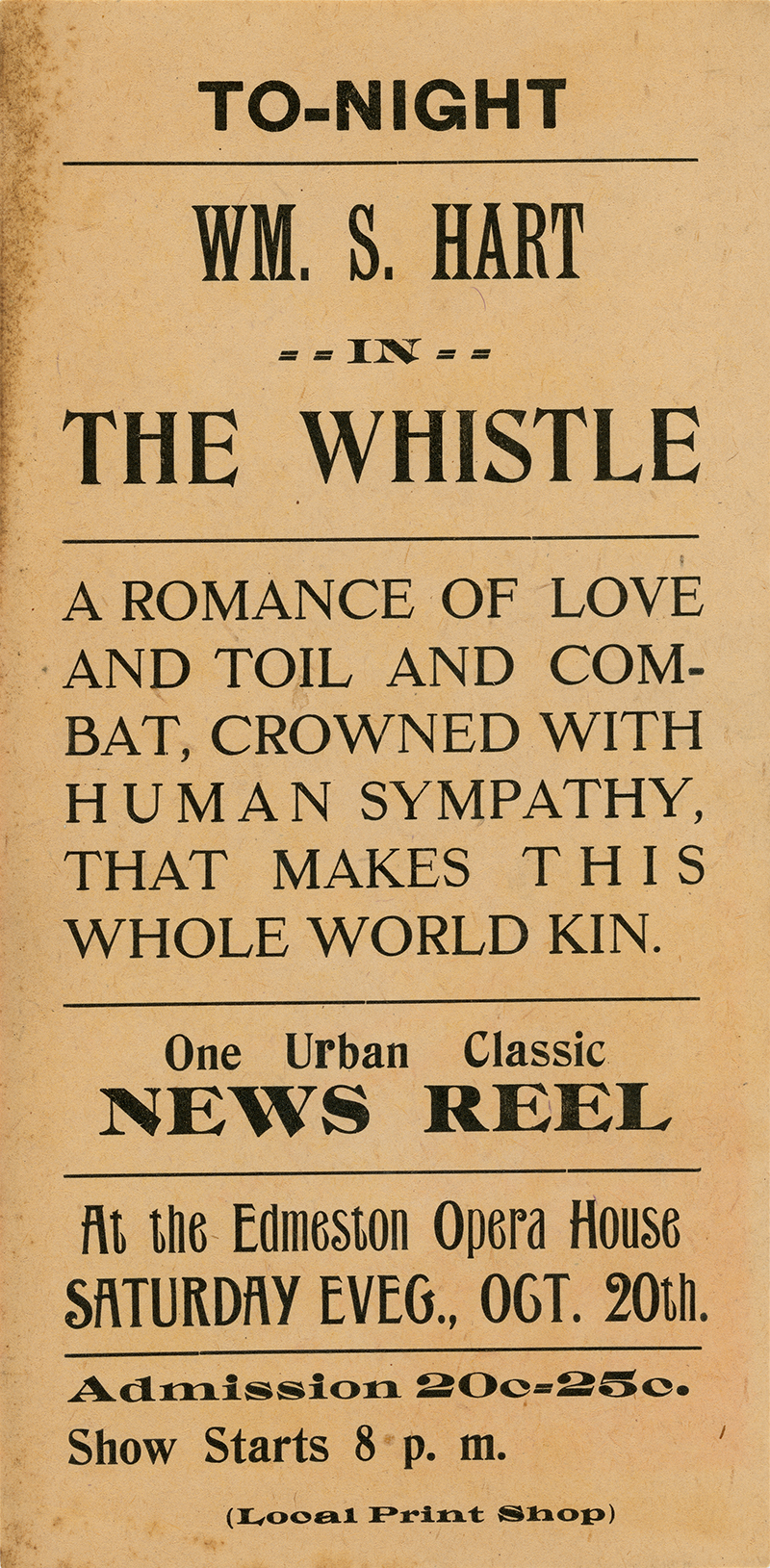 Handbill advertising William S. Hart in "The Whistle," showing at the Edmeston Opera House, N.Y., Saturday evening, October 20, 1923. At least we think it's 1923; "The Whistle" premiered in 1921, but October 20 wasn't a Saturday in 1921. It was a Saturday in 1923.