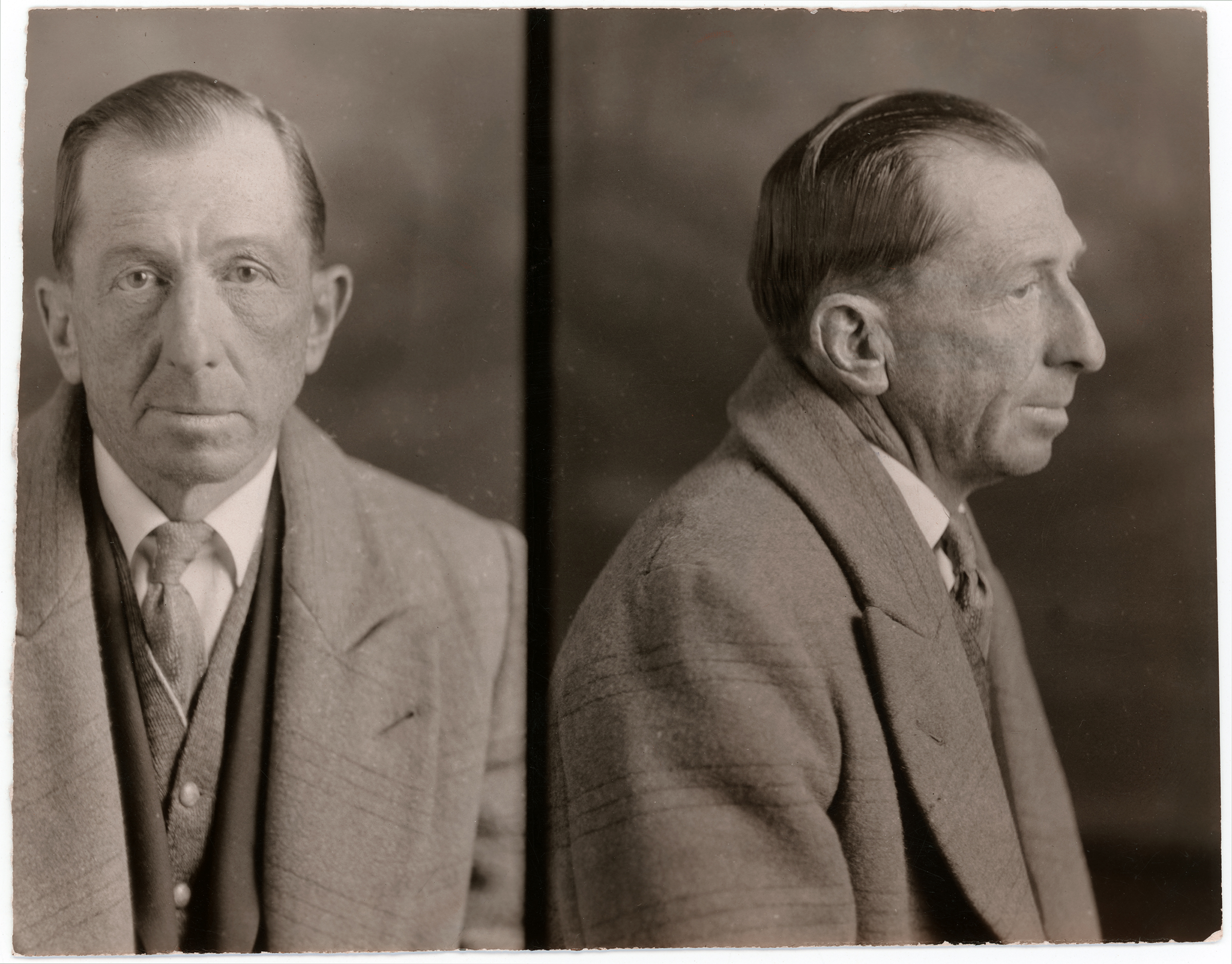 Vernon was captured December 3, 1929; the back of this approx. 5¾x4½-inch print is date-stamped December 28, 1929, N.E.A. (Newspaper Enterprise Association). So, these are probably post-capture mughots rather than earlier BOLO photos (Be On the LookOut for).