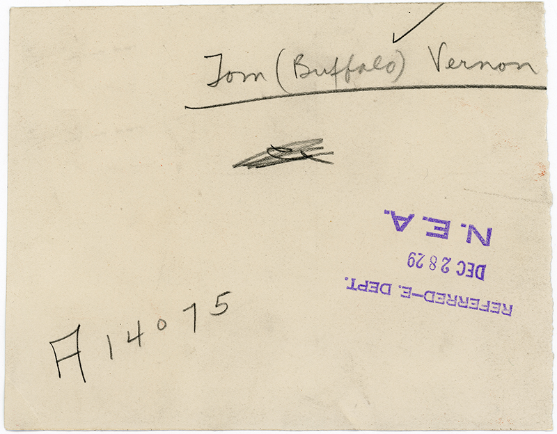 Handwriting on the back reads, "Tom (Buffalo) Vernon," suggesting that someone on the news desk bought into the fiction that Tom Vernon was "Buffalo" Vernon, a onetime rodeo star. Vernon used many aliases and made up many stories about himself, none of which were true. He was simply a con man and horse thief — and not a very good one. He spent at least half of his life behind bars and ended up living in a Sacramento flop house. He attempted to sell his make-believe autobiographical story to a magazine until the bitter end, which came in 1967.