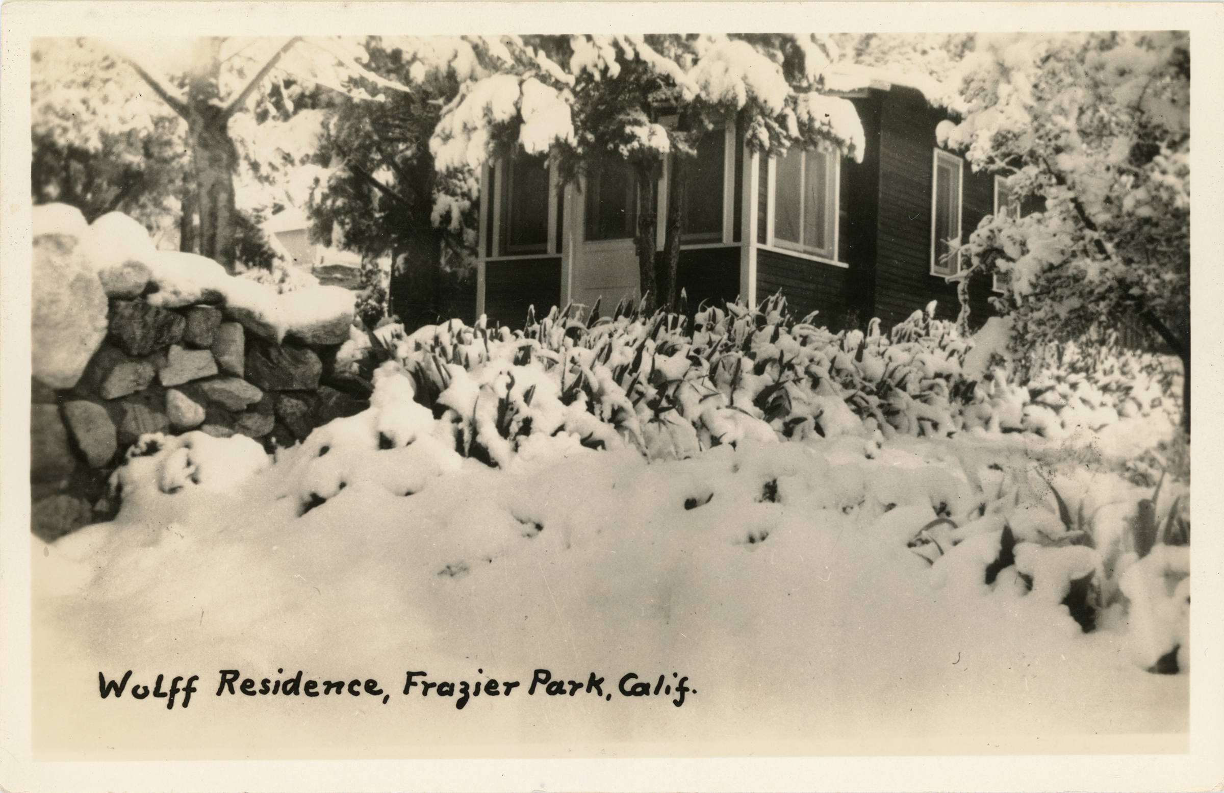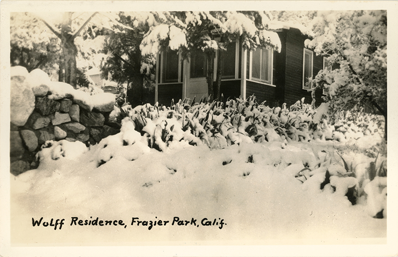 Wolff residence in the snow, Frazier Park, circa 1940s.