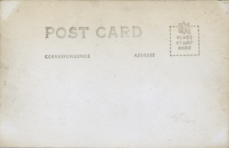 Real photo postcard processed by EKC, which printed "Place Stamp Here" in the stamp box (see below) from 1930 to 1950, giving us an "earliest" and "latest" date. (Source: Philatelist and postcard dealer Ron Playle, 1937-2018, Playle's Auctions, accessed 2019).