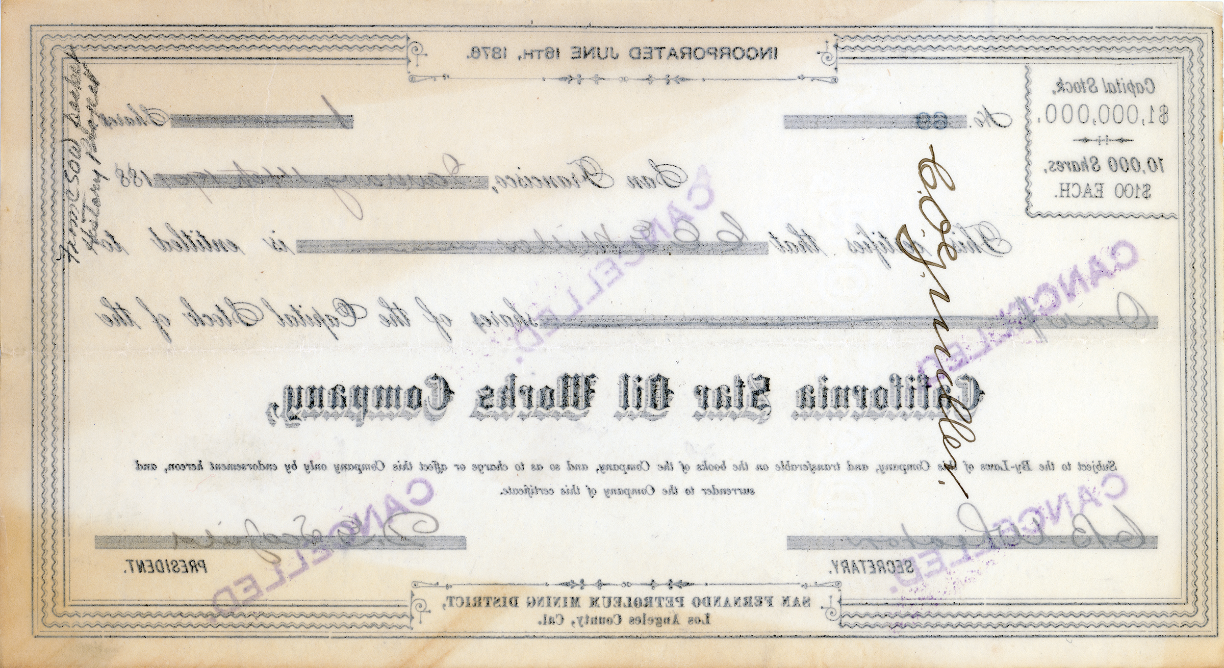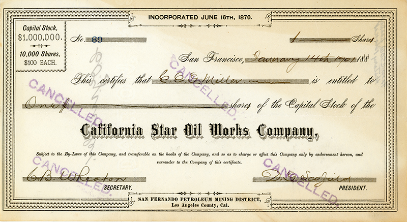 Important Mentryville-related document. California Star Oil Works stock certificate representing 1 share, issued January 14, 1901, at San Francisco to Christian Otto Geberding "C.O.G." Miller (1865-1952),