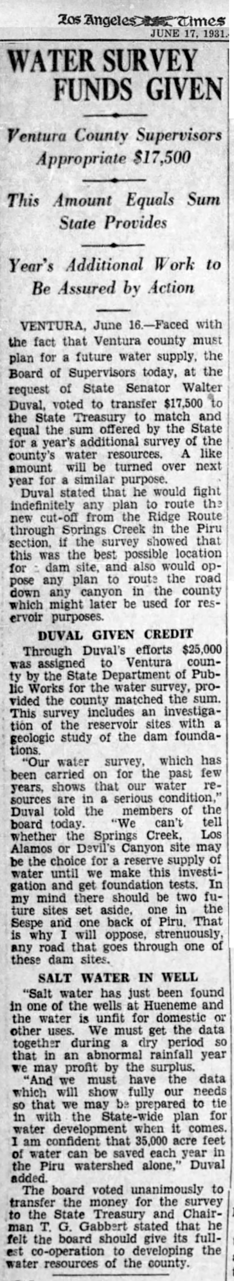 Ventura, June 16 — Faced with the fact that Ventura county must plan for a future water supply, the Board of Supervisors today, at the request of State Senator Walter Duval, voted to transfer $17,500 to the State Treasury to match and equal the sum offered by the State for a year's additional survey of the county's water resources. A like amount will be turned over next year for a similar purpose.