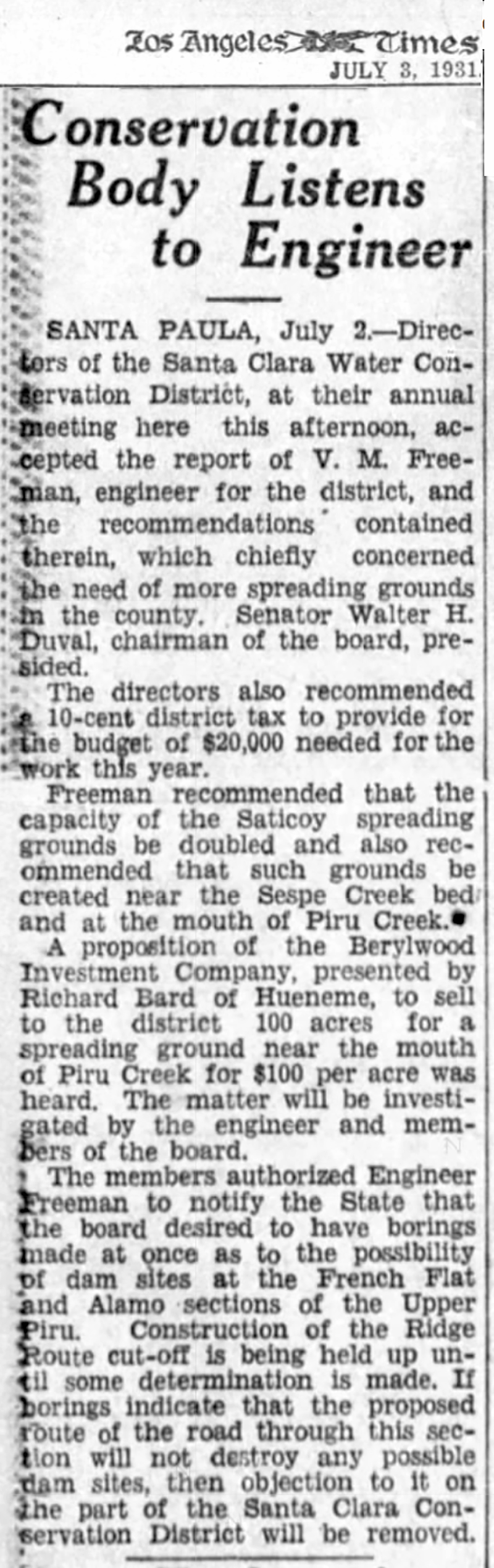 Santa Paula, July 2. — Directors of the Santa Clara Water Conservation District, at their annual meeting here this afternoon, accepted the report of V.M. Freeman, engineer for the district, and the recommendations contained therein, which chiefly concerned the need of more spreading grounds in the county. Senator Walter H. Duval, chairman of the board, presided.