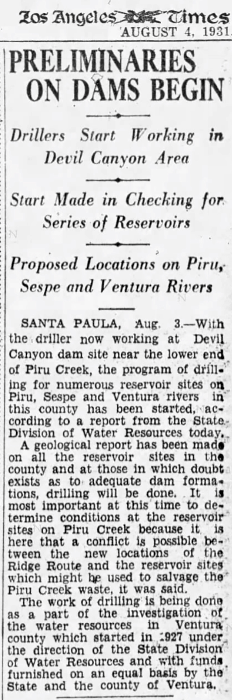 Santa Paula, Aug. 3. — With the driller now working at Devil Canyon dam site near the lower end of Piru Creek, the program of drilling for numerous reservoir sites on Piru, Sespe and Ventura rivers in this county has been started, according to a report from the State Division of Water Resources today.