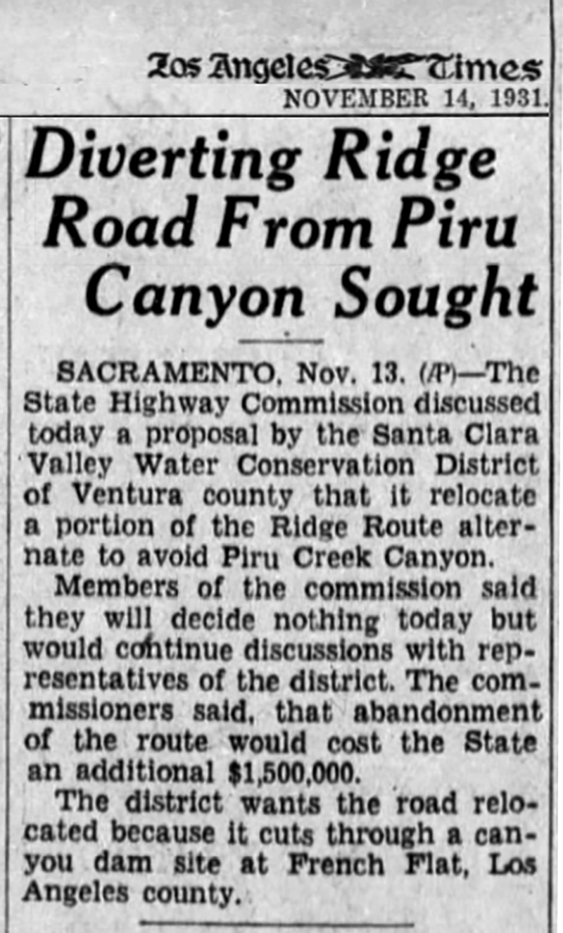 According to the Venturans' political champion, state Sen. Walter H. Duval — himself a Conservation District director — the noted geologists Charles P. Berkey (1867-1955) and Paul F. Kerr particularly liked a location they referred to as "French Flats." Sadly, they were too late. The state was already invested in plans to run the Ridge Route Alternate through the area now known as Frenchman's Flat campground. Over the Venturans' vehement protestations, the state ran the Ridge Route Alternate through the coveted dam site in 1933, criss-crossing Piru Creek.