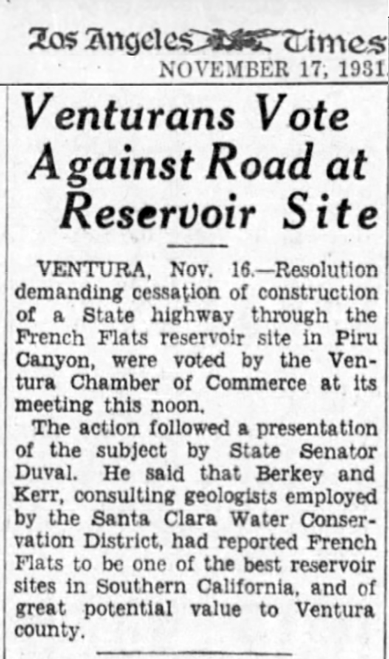 The action followed a presentation of the subject by State Senator Duval. He said that Berkey and Kerr, consulting geologists employed by the Santa Clara Water Conservation District, had reported French Flats to be one of the best reservoir sites in Southern California, and of great potential value to Ventura county.