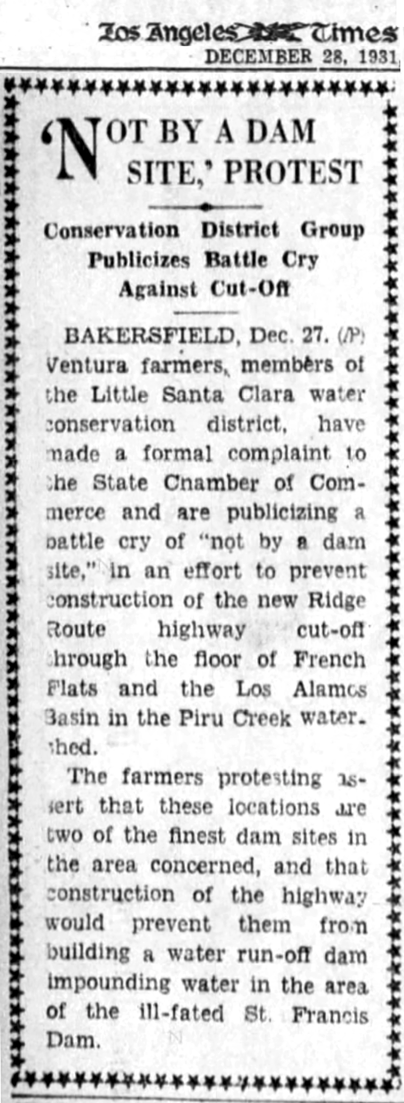 Bakersfield, Dec. 27. (AP) Ventura farmers, members of Little Santa Clara water conservation district, have made a formal complaint to the State Chamber of Commerce and are publicizing a battle cry of "not by a dam site," in an effort to prevent construction of the new Ridge Route highway cut-off through the floor of French Flats and the Los Alamos Basin in the Piru Creek watershed.