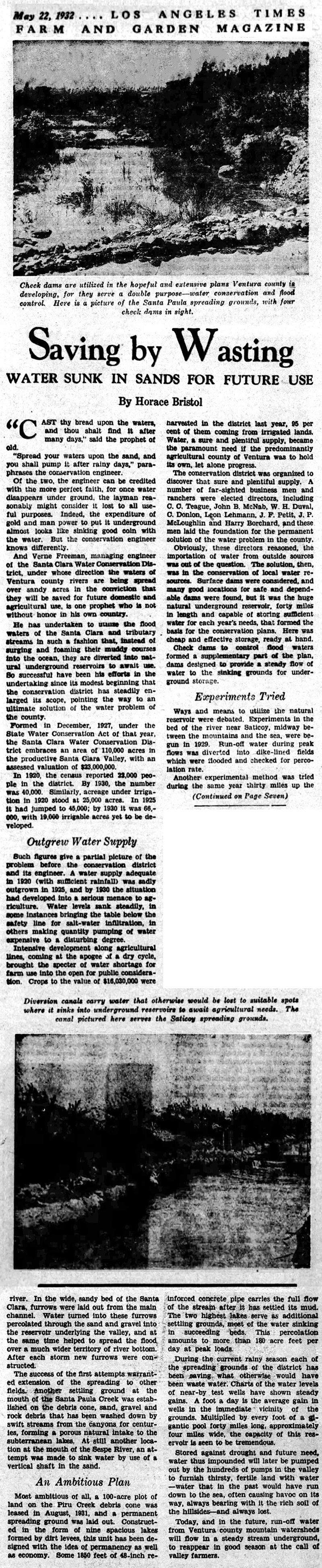 And Verne Freeman, managing engineer of the Santa Clara Water Conservation District, under whose direction the waters of Ventura county rivers are being spread over sandy acres in the conviction that they will be saved for future domestic and agricultural use, is one prophet who is not without honor in his own country.