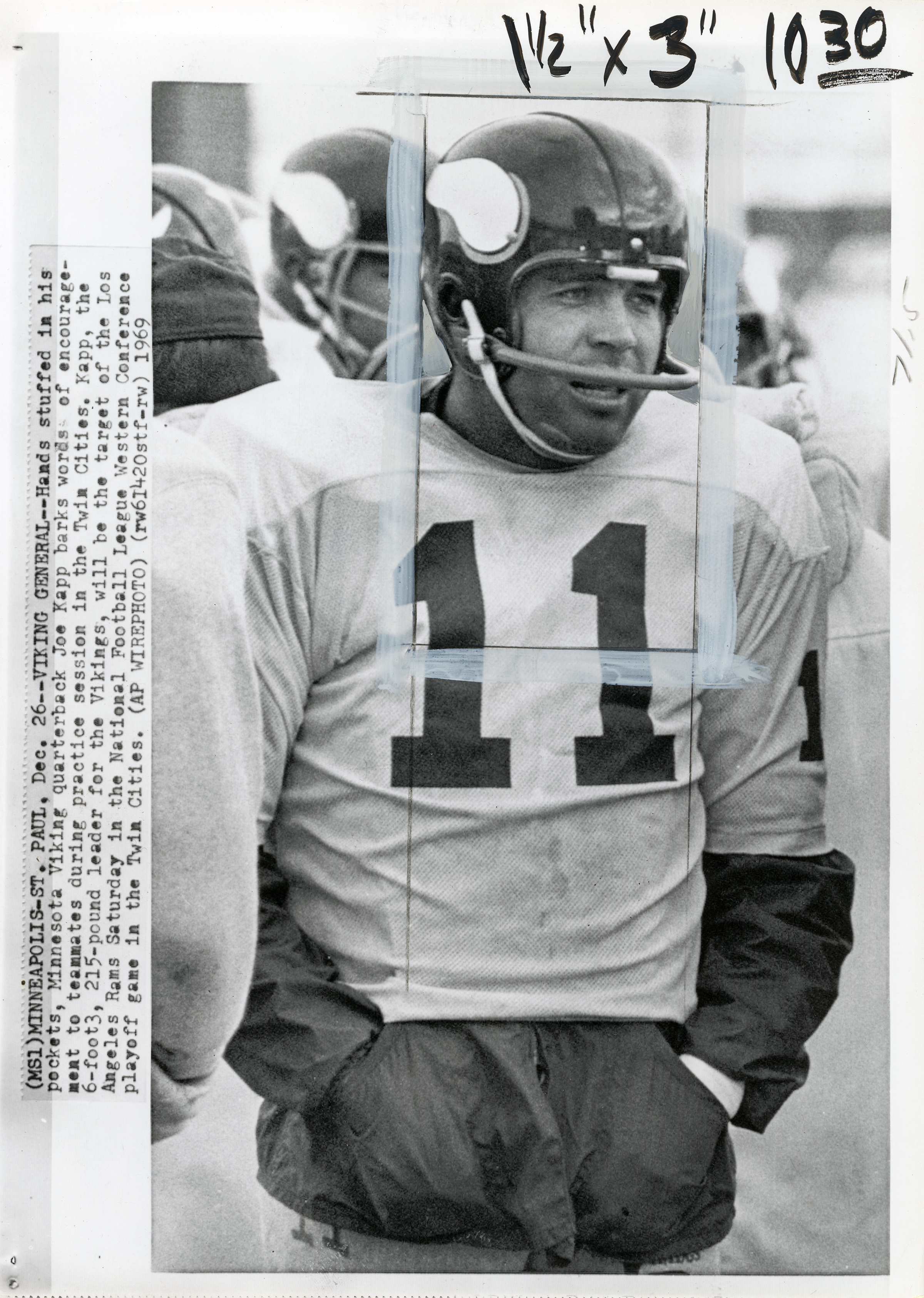 (MS1) MINNEAPOLIS-ST. PAUL, Dec. 26 — VIKING GENERAL — Hands stuffed in his pockets, Minnesota Viking quarterback Joe Kapp barks words of encouragement
