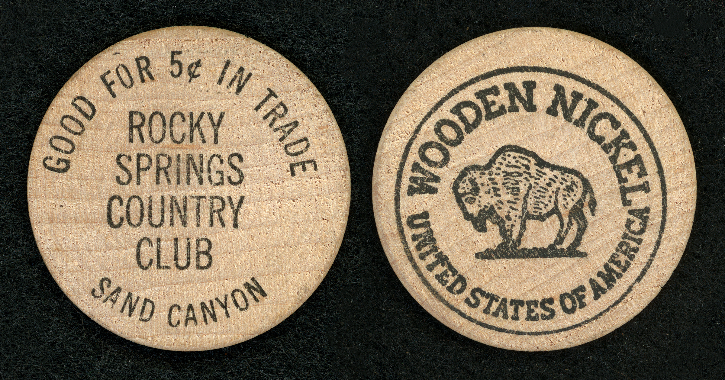 Wooden nickel (token), 1½-inch diameter, "Good for 5¢ in Trade" at Ace Cain's Rocky Springs Country Club in Sand Canyon. Issued in the 1950s and/or 1960s.